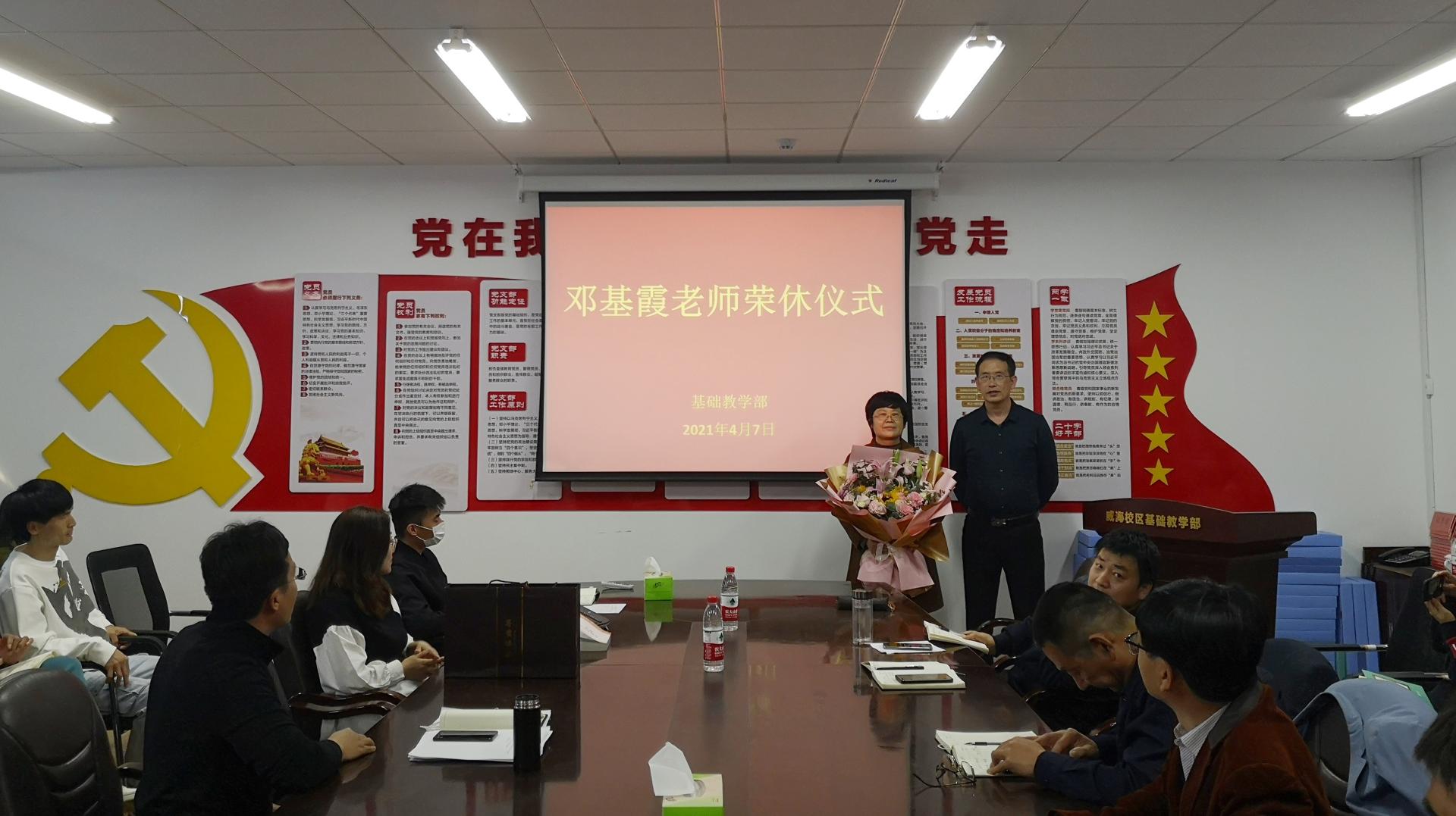 4月7日下午,基础教学部在威海校区2号教学楼A405会议室为邓基霞副教授举行了荣休仪式。基础教学部副主任唐敬伟、江娜及全体教师参加了活动。唐敬伟主持仪式。