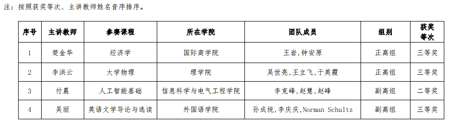 本次大赛全省共有71所学校的342名教师参加了正高组、副高组和中级组的比赛。比赛分校级初赛、省级决赛两个部分,100位选手晋级省级现场决赛,择优确定一等奖15项、二等奖30项、三等奖55项。我校共推荐7名教师参加本次大赛,最终4名教师晋级省级现场决赛,7进4的晋级率在全省名列前茅。经过激烈角逐,信息科学与电气工程学院副教授付晨获得二等奖,理学院教授李洪云、国际商学院教授楚金华、外国语学院副教授吴丽获得三等奖。