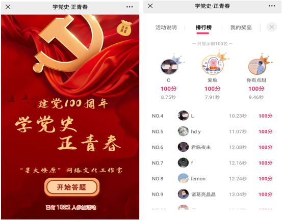参赛者通过“交院小5”微信公众号“习语课堂”栏目,点击“党史‘答’人”模块即可参与,活动评选“今日‘答’人幸运星”和“‘答’人金榜”,设置抽奖环节,配发定制文创奖品。活动一经推出,同学们便踊跃参与,短短数小时就引来上千人参与线上答题。大家纷纷表示,活动既有竞技性又有趣味性,极大地激发了自己学习党史知识的热情。