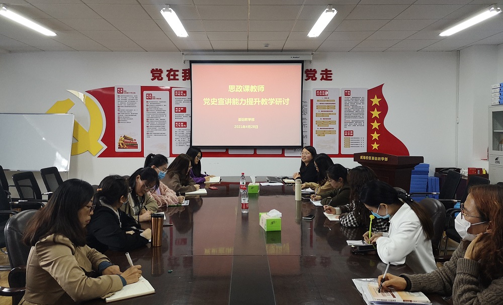 4月28日下午,基础教学部思政课教师党史宣讲能力提升专题教学研讨活动在威海校区2号教学楼A405会议室举行,政治教研室全体思政课教师参加了此次活动。
