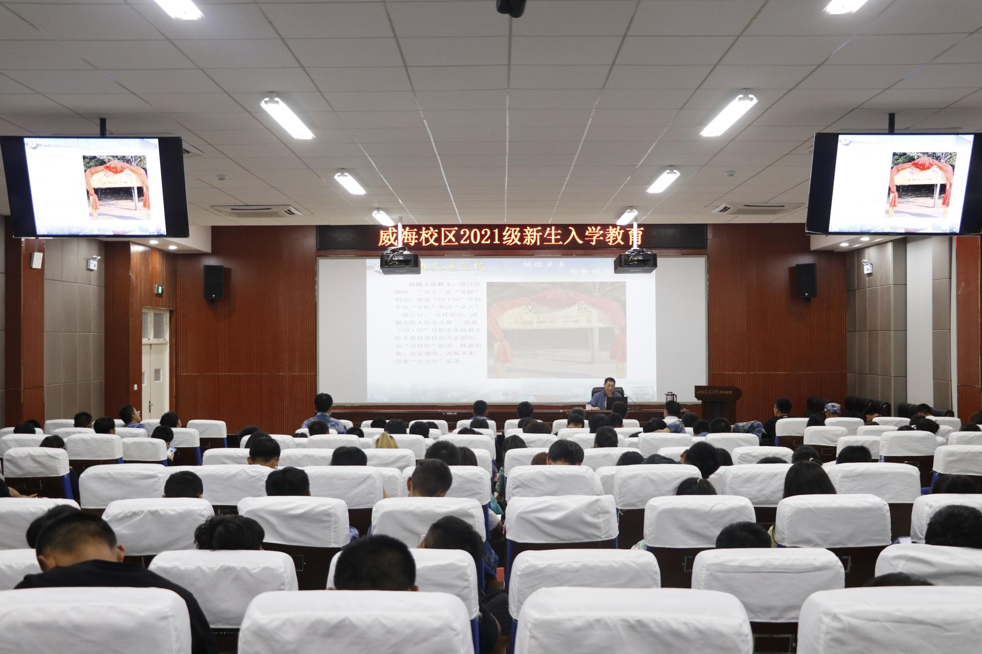 在学校65周年校庆来临之际,为深入开展爱党爱国、兴校荣校教育,近日,威海校区开展2021级新生入学教育,学校工会主席娄进举受邀作专题讲座。