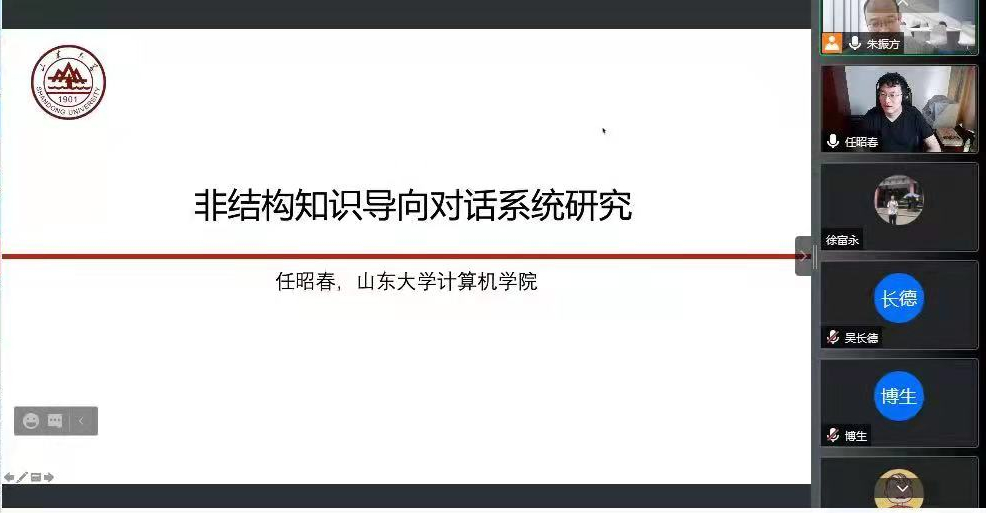 山东大学任昭春教授于9月29日作了题为《非结构化知识导向对话系统》的报告,报告针对如何有效选择和利用知识来增强生成回复的信息量的问题,介绍了基于跨语言知识的对话任务,利用大量的辅助语言对话语料,通过知识蒸馏的方法来增强目标语言的知识获取与表达能力,并标注了首个跨语言知识对话测试数据集来促进相关的研究。