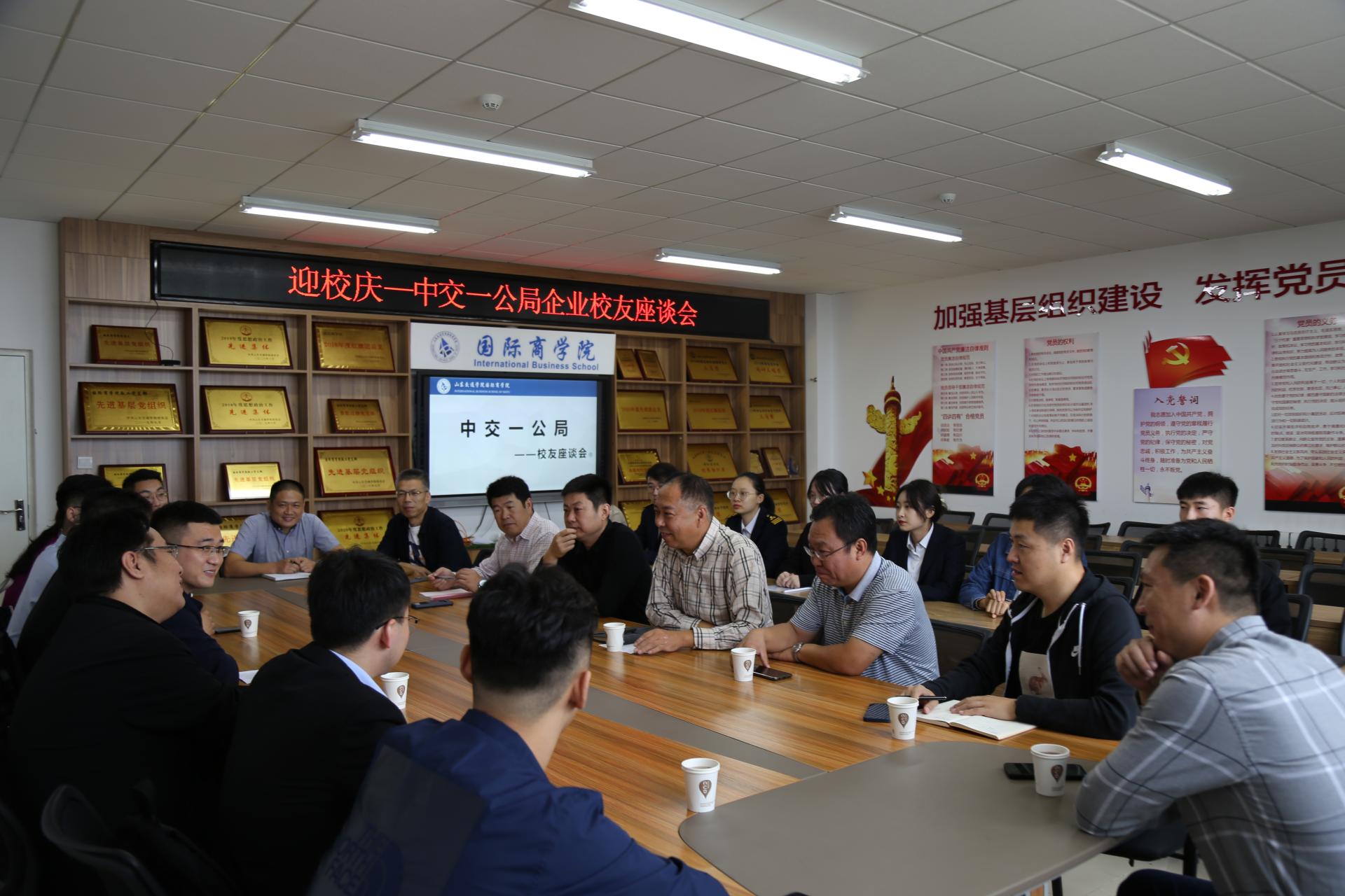 近日,国际商学院于威海校区2号教学楼B410组织召开“迎校庆——中交一公局企业校友”座谈会。中交一公局集团人力资源部主任付松涛、邓振涛等五位优秀校友,威海校区各二级学院党委书记、副书记,威海校区管理办公室学团工作部相关负责人参加座谈会,会议由国际商学院党委书记刘佳军主持。