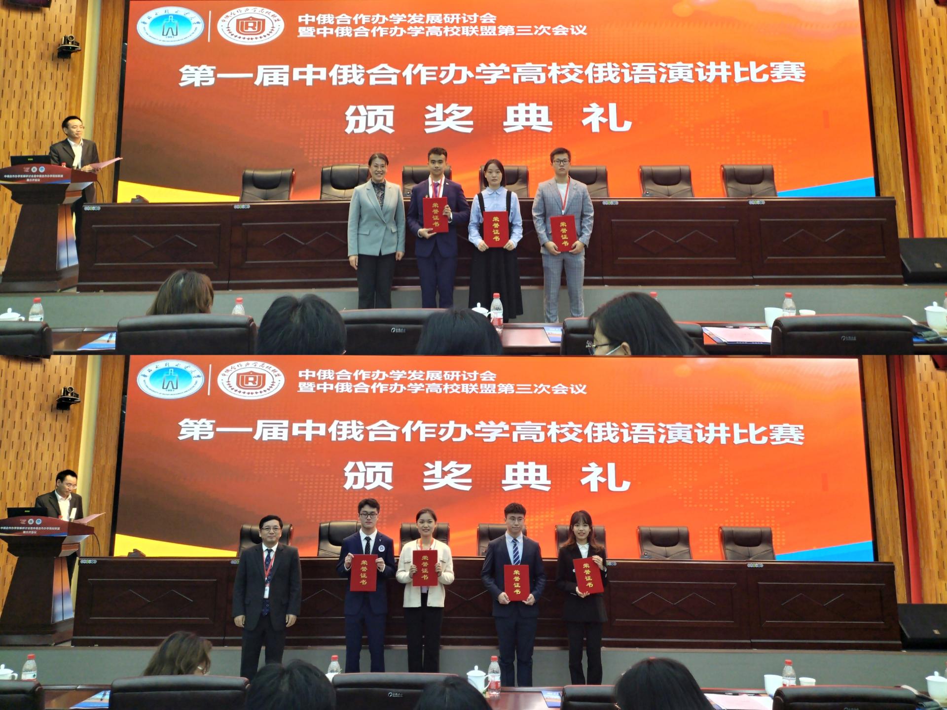 10月10日,第一届中俄合作办学高校俄语演讲比赛在河南郑州举行。我校顿河学院派出两名选手参赛,经过激烈角逐,顿河学院二年级学生赵东乐获得低年级组一等奖第1名,三年级学生辛逸阳获得高年级组一等奖第2名。我校成为本次大赛唯一一所包揽低年级组、高年级组两个组别一等奖的高校。