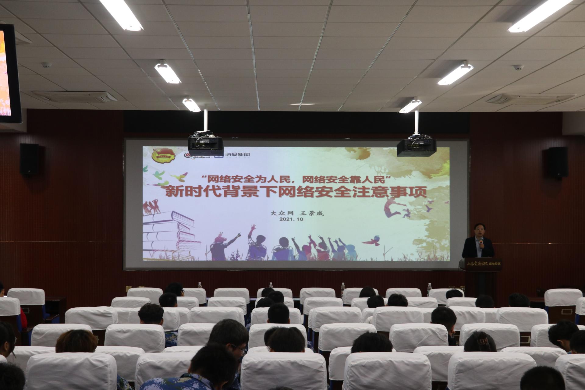 活动邀请了大众网记者王景成进行宣讲。王景成以《新时代背景下网络安全注意事项》为题,从新时代下的网络特点、如何增强网络文明意识及网络安全意识、如何争做好网民、讲好威海好故事三个篇章,为同学们深刻剖析了新时代背景下网络给人们带来的方便与问题,并通过一系列真实案例充分讲解了如何辨识、预防和抵制网络诈骗,以及如何在新时代背景下建立网络安全思维,做新时代好网民。