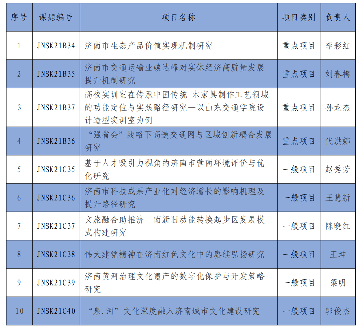 近日,济南市哲学社会科学工作办公室公布了2021年度济南市哲学社会科学课题立项名单,我校《济南市生态产品价值实现机制研究》等10项课题获得立项,其中,重点项目4项,一般项目6项。