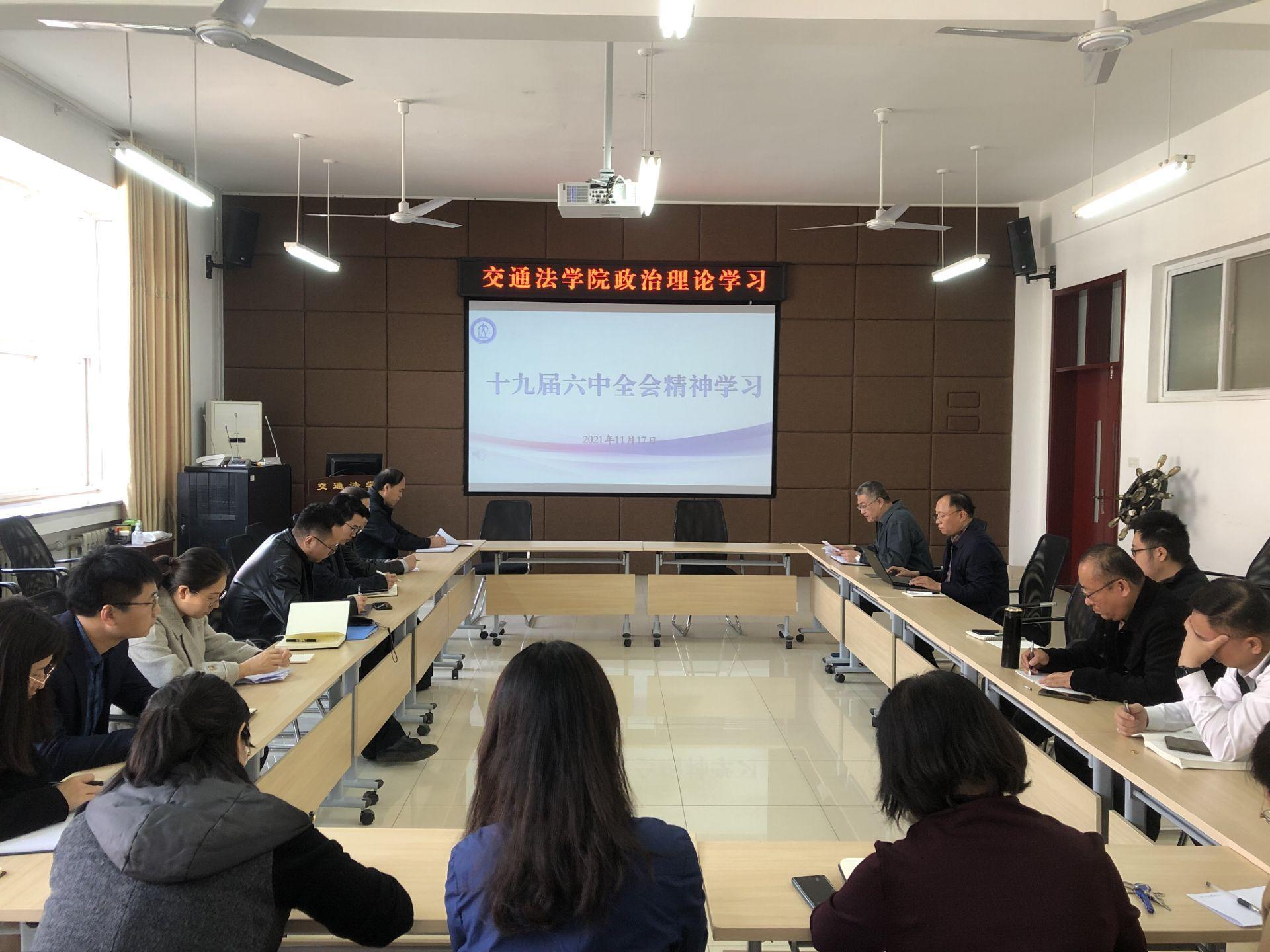 11月17日,交通法学院党委组织全体教职工开展政治理论学习,专题传达学习党的十九届六中全会精神。