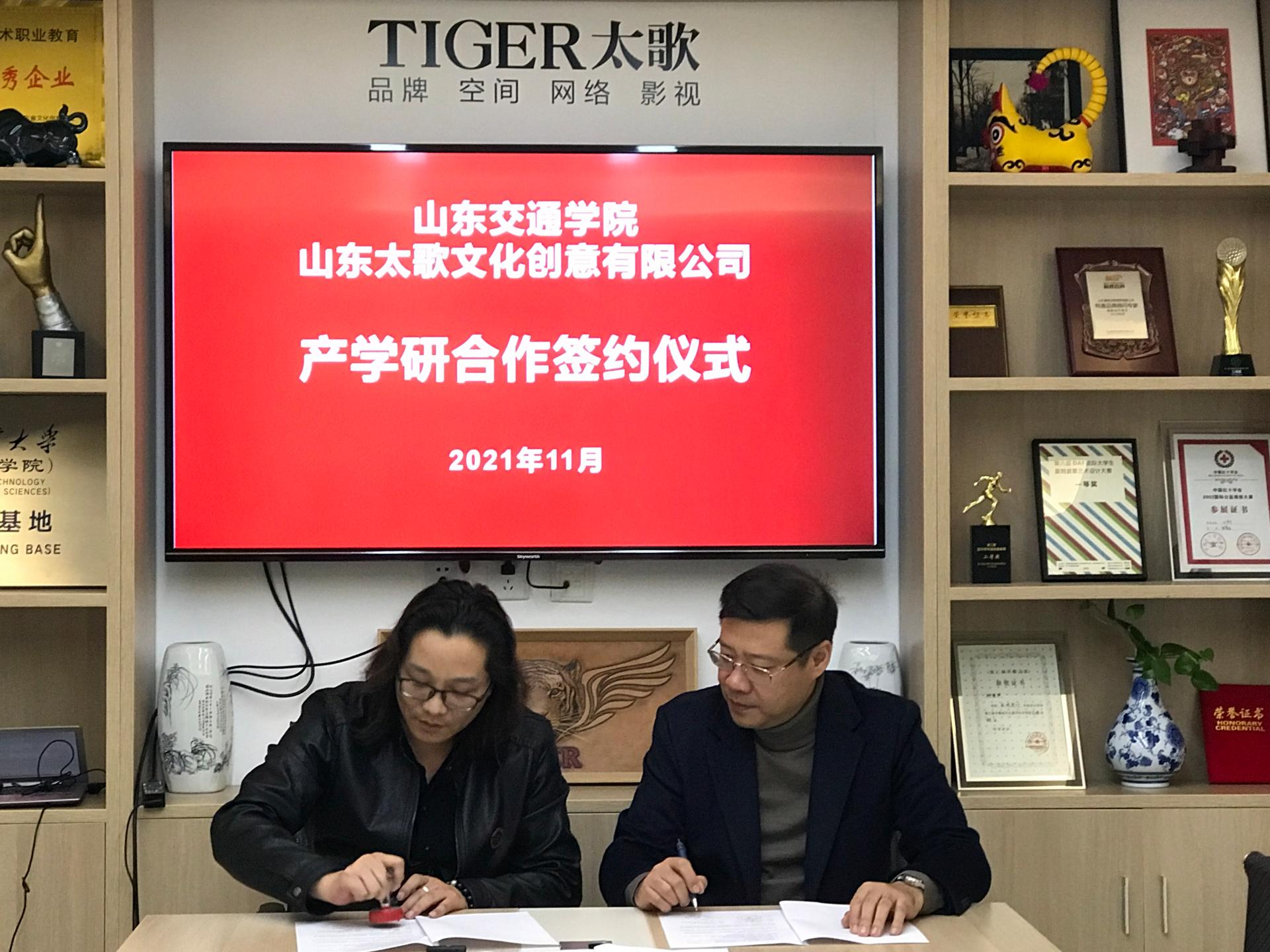 近日,艺术与设计学院与山东太歌文化创意有限公司签署产学研合作协议并举行基地挂牌仪式。山东太歌文化创意有限公司总经理胡尊照、相关业务部门负责人,艺术与设计学院院长孙龙杰、党委副书记亓秀梅及学院相关人员参加活动。