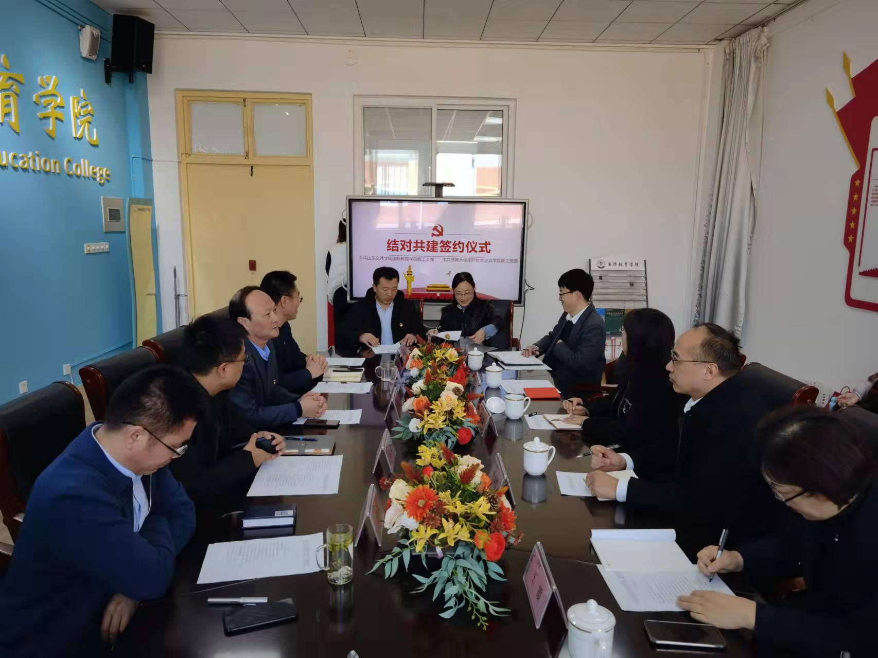 观展后,我校国际教育学院教工党支部与济南大学国际教育交流学院教工党支部在长清校区2B510举行了结对共建签约仪式,并就留学生招生、培养、管理以及就业等工作进行了座谈交流。双方表示,今后将进一步加强合作交流,相互取长补短,共同促进留学生工作的发展和提升。