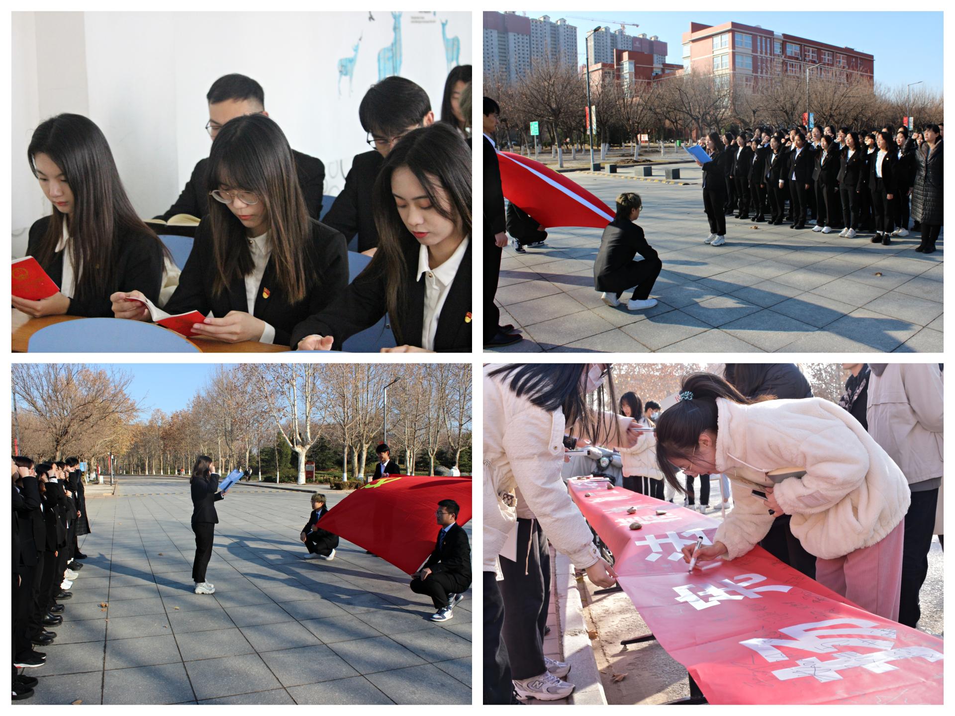活动中,师生党员身着正装,佩戴党徽,齐声朗读《中华人民共和国宪法》。他们声音洪亮,坚毅的目光中透露出对党和宪法的忠诚。党员们面向党旗,郑重地举起右拳,重温入党誓词,铿锵有力的声音饱含对党的深情。最后,大家在长清校区明德大桥北侧和二号餐厅前开展了“国家宪法日”宣传活动。通过设立宣传点、悬挂宣传横幅及签名、发放宣传资料等多种方式宣传了《宪法》,增强了我校师生的法律意识,提高了运用法律武器维护合法权益的能力,掀起学法知法、守法爱法的法制宣传热潮。