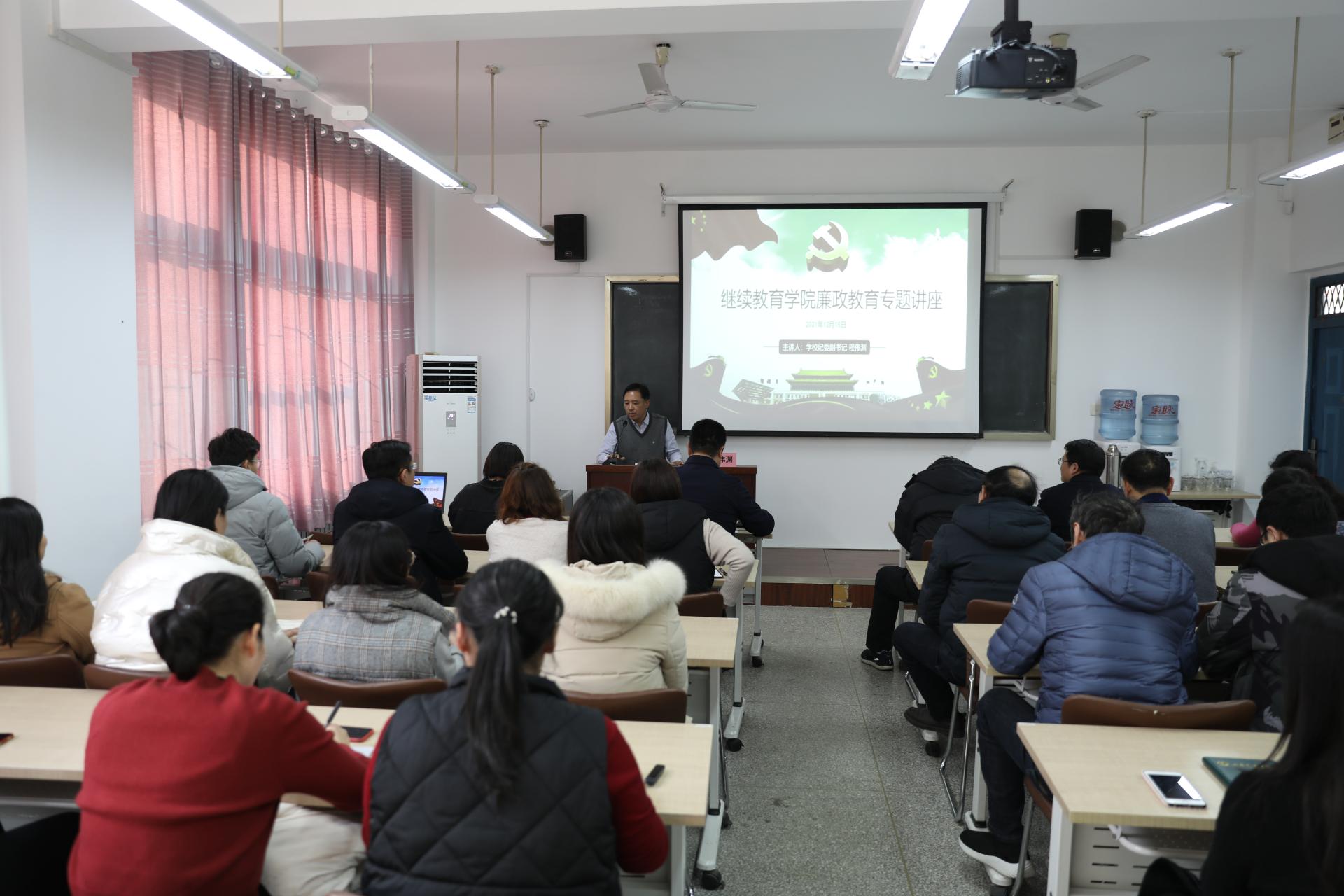 12月16日下午,学校纪委副书记程伟渊同志为继续教育学院教职工作廉政教育专题讲座。继续教育学院党总支书记、院长宋光军主持讲座。