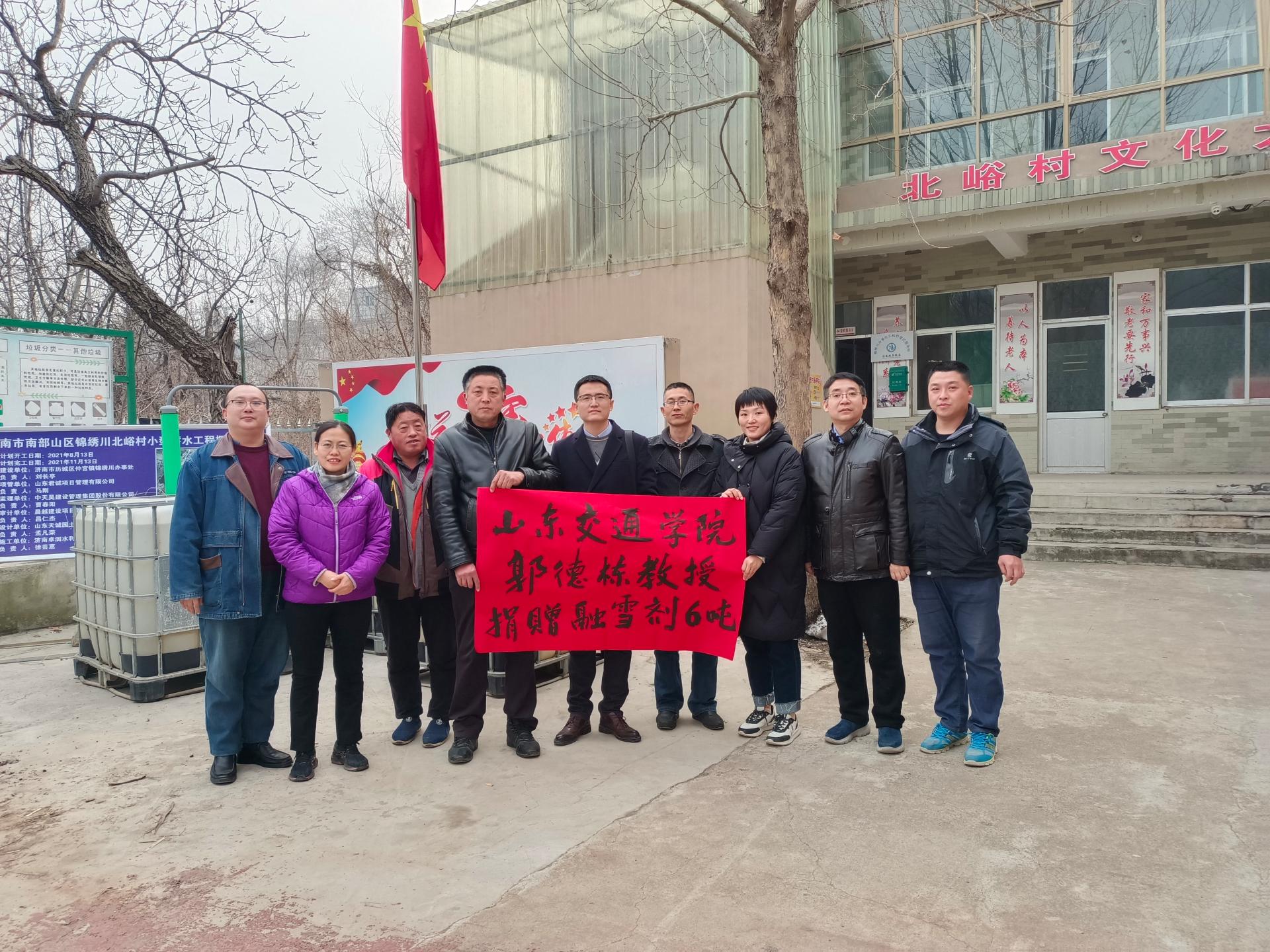 为解决北峪村和槲疃村冬季雪后出行问题,降低交通事故风险,座谈会后,郭德栋捐赠6吨融雪剂,并现场指导村民道路融雪除冰的方法。该融雪剂是郭德栋科研团队自主研发的绿色、高效、环保产品,由山东东木顺成交通科技研发有限公司生产,主要用于冬季高速公路、城市道路以及机场道路的融雪防滑。