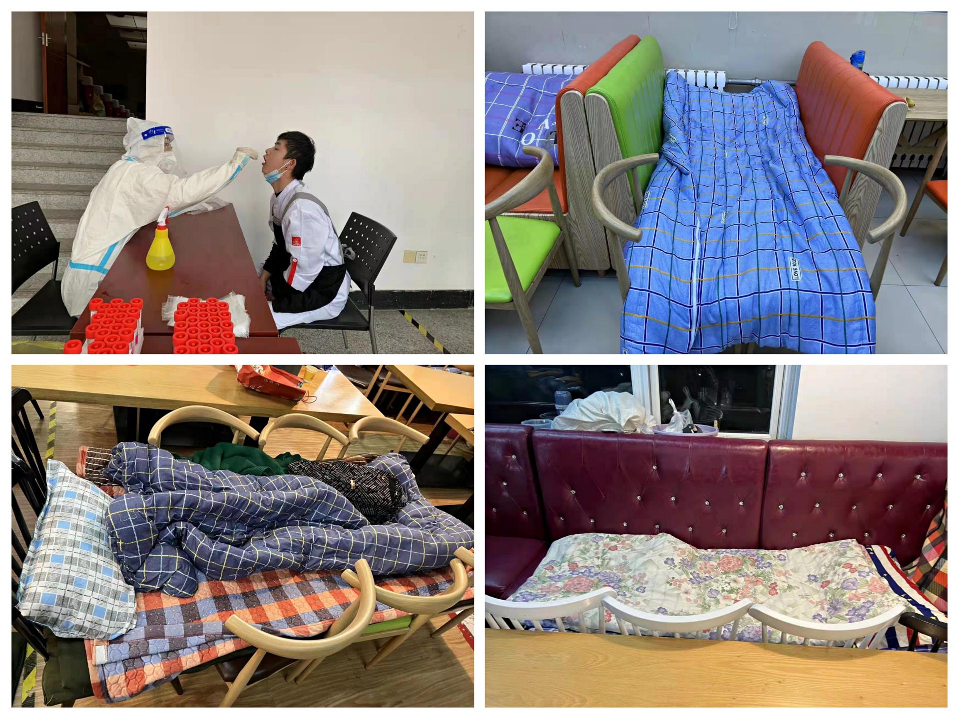 校园封闭管理之后,学校餐厅的员工便再没有回过家,白天这里是工作的地方,夜晚这里便是大家的卧室,几张椅子拼在一起就是一张“单人床”。虽然不能外出,在校园里服务的员工们疫情防控工作丝毫没有松懈,他们每天坚持做核酸,坚持戴口罩,坚持对餐厅各个角落进行消杀,确保师生用餐环境的安全。