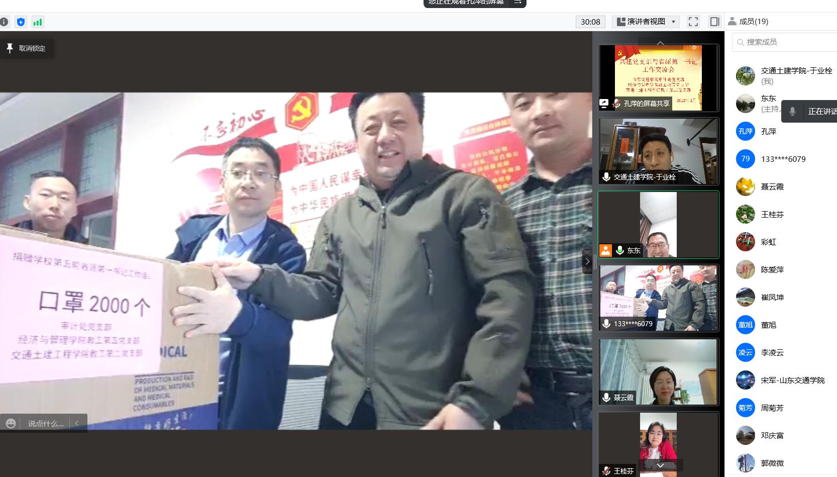 会上,学校第五轮省派第一书记工作组组长马昭介绍了学校第五轮省派第一书记工作组的基本情况及乡村振兴工作开展情况。审计处副处长王桂芬、经济与管理学院副院长聂云霞、交通土建工程学院教工第二党支部书记于业栓、经济与管理学院教工第五党支部书记孔萍分别介绍了各党支部的基本情况,并结合各自专业对第一书记工作组乡村振兴工作提出了建议。共建支部党员代表与第五轮省派第一书记工作组开展了集体学习与交流,向第五轮省派第一书记工作组捐赠口罩2000个,送上对第一书记们的关心与敬意。