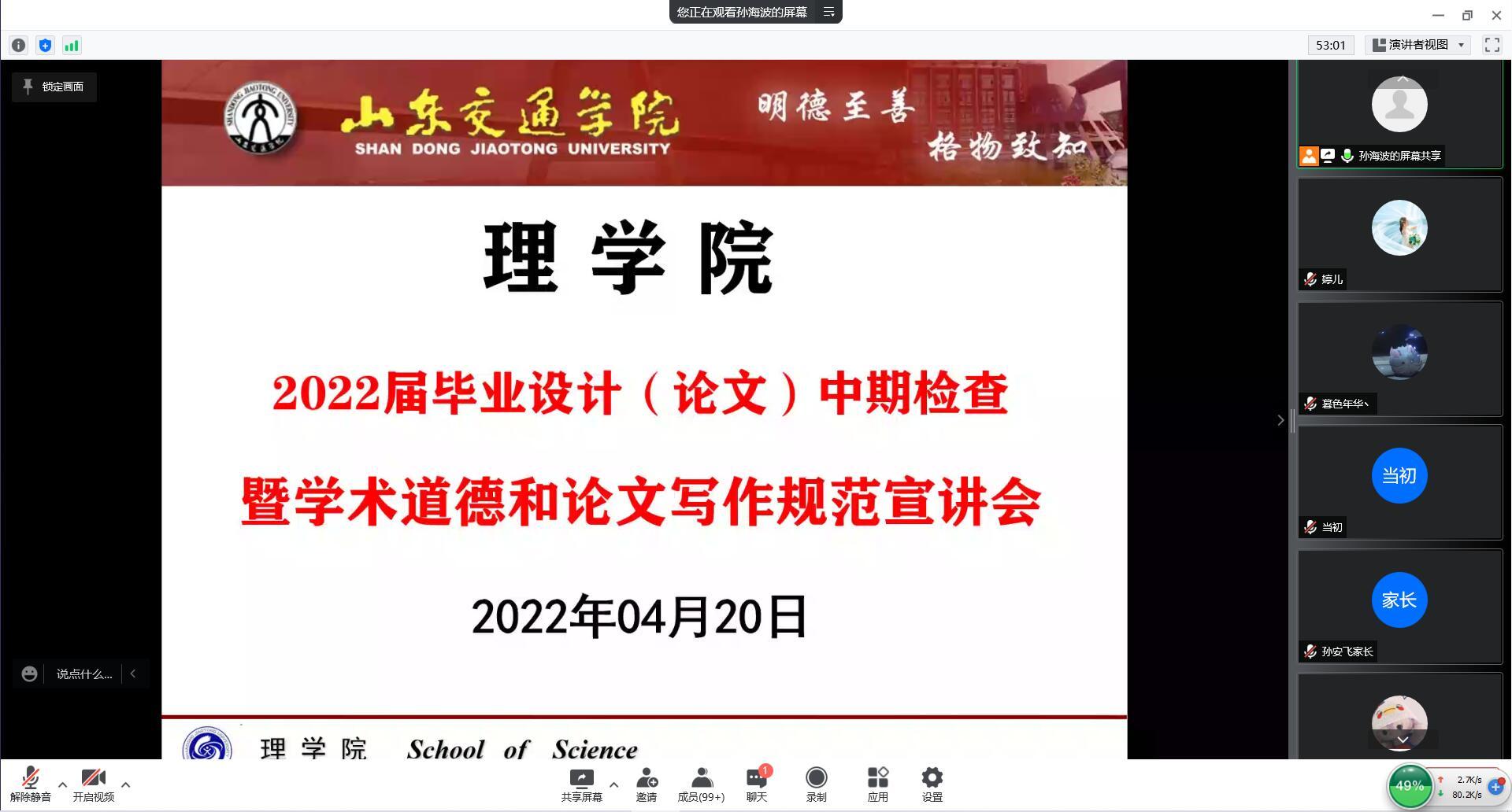 理学院通过线上形式展开宣讲会。理学院全体毕业生及论文指导老师及学生工作负责人参加会议。会议由理学院副院长孙海波主持。会上,孙海波就毕业设计(论文)中期检查工作进行了部署,就《本科生毕业设计(论文)抽检办法》和《本科生毕业设计(论文)写作规范》等文件进行了解读。他指出,毕业设计(论文)是学生综合应用能力的全面检查,希望全体学生务必重视;各系要严格执行论文查重和抽检制度,严格执行“双导师制”,避免抄袭、伪造、代写论文等有违学术道德的行为,争创高质量论文。学生工作负责人就后期就业推进工作进行了详细介绍,提出了“两点要求”,一要认真遵守属地疫情防控工作要求,二要认真完成毕业论文,争取顺利毕业,成功就业。
