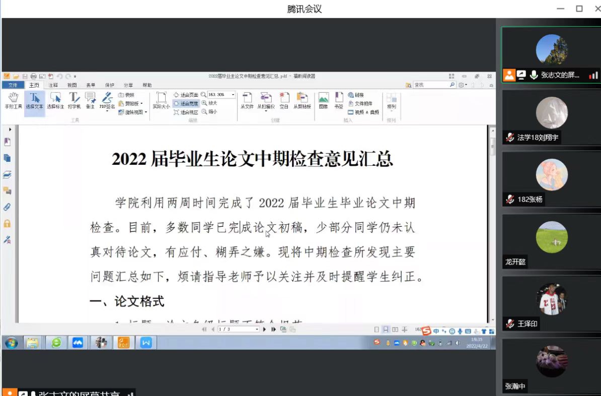 为进一步提高毕业设计(论文)质量,规范本科生毕业设计(论文)写作,加强学术道德和学风建设。结合目前疫情防控形势,近日,各二级学院举行了2022届毕业设计(论文)中期检查暨学术道德和论文写作规范线上宣讲会。