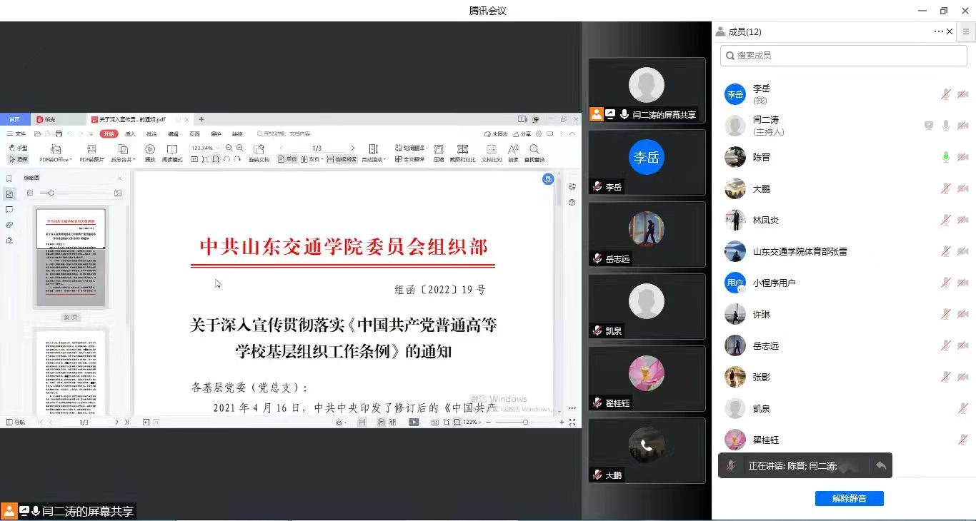 体育教学部党总支召开理论学习中心组扩大会议,通过线上形式开展学习《中国共产党普通高等学校基层组织工作条例》专题党课活动,活动由体育教学部第二支部书记闫二涛主持。