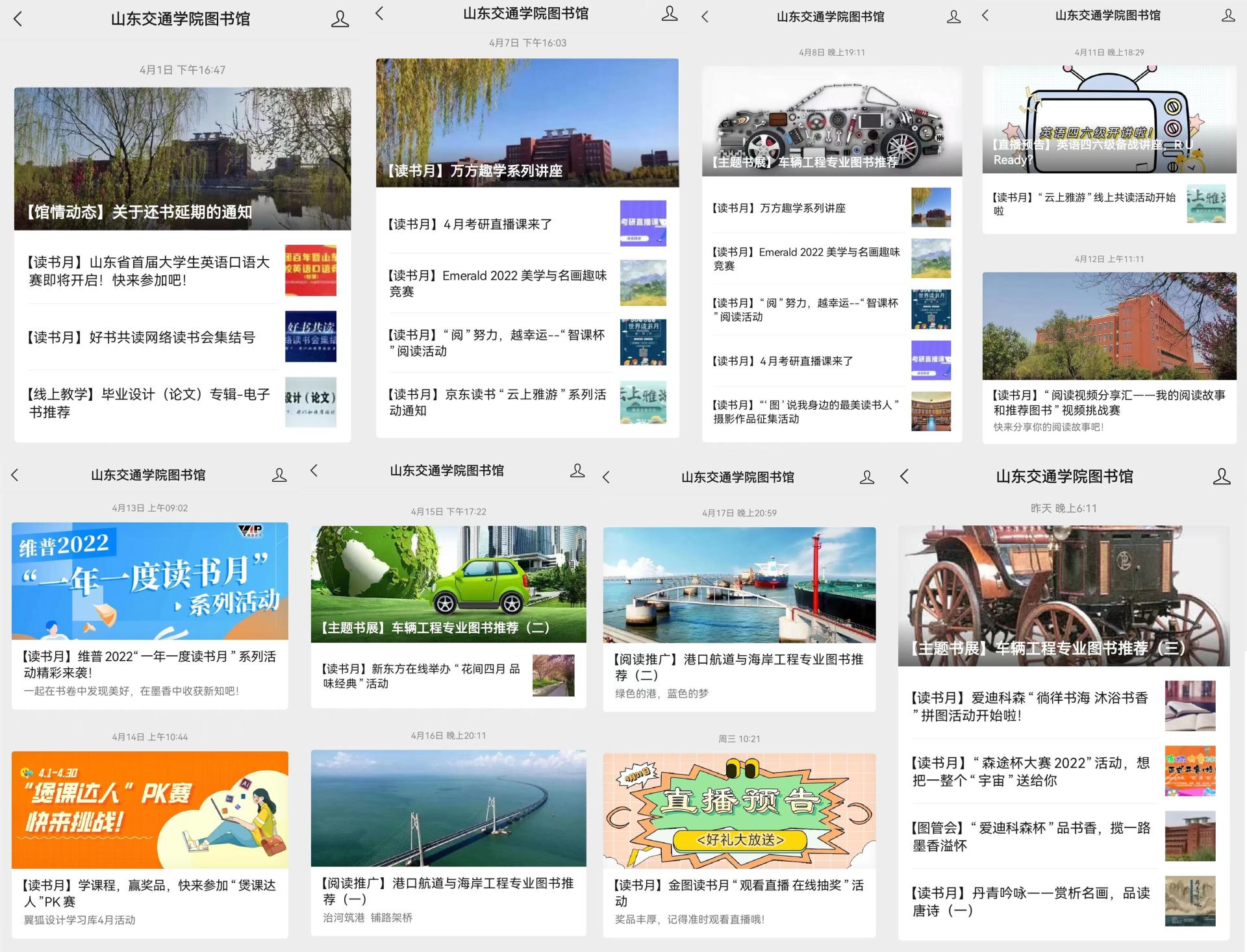 据悉,图书馆“世界读书日”系列活动自4月初陆续开展,包括“云上雅游”线上共读、“‘图’说我身边的最美读书人”摄影作品征集活动、“阅读视频分享汇——我的阅读故事和推荐图书”视频挑战赛、主题书展、“丹青吟咏——赏析名画 品读唐诗”等板块。活动以“学习与竞赛”的形式倡导和提升读者数字阅读意识、数字阅读能力,引导读者开展高质量阅读和深度阅读,营造浓厚的学习气氛,推进书香校园、文明校园建设。