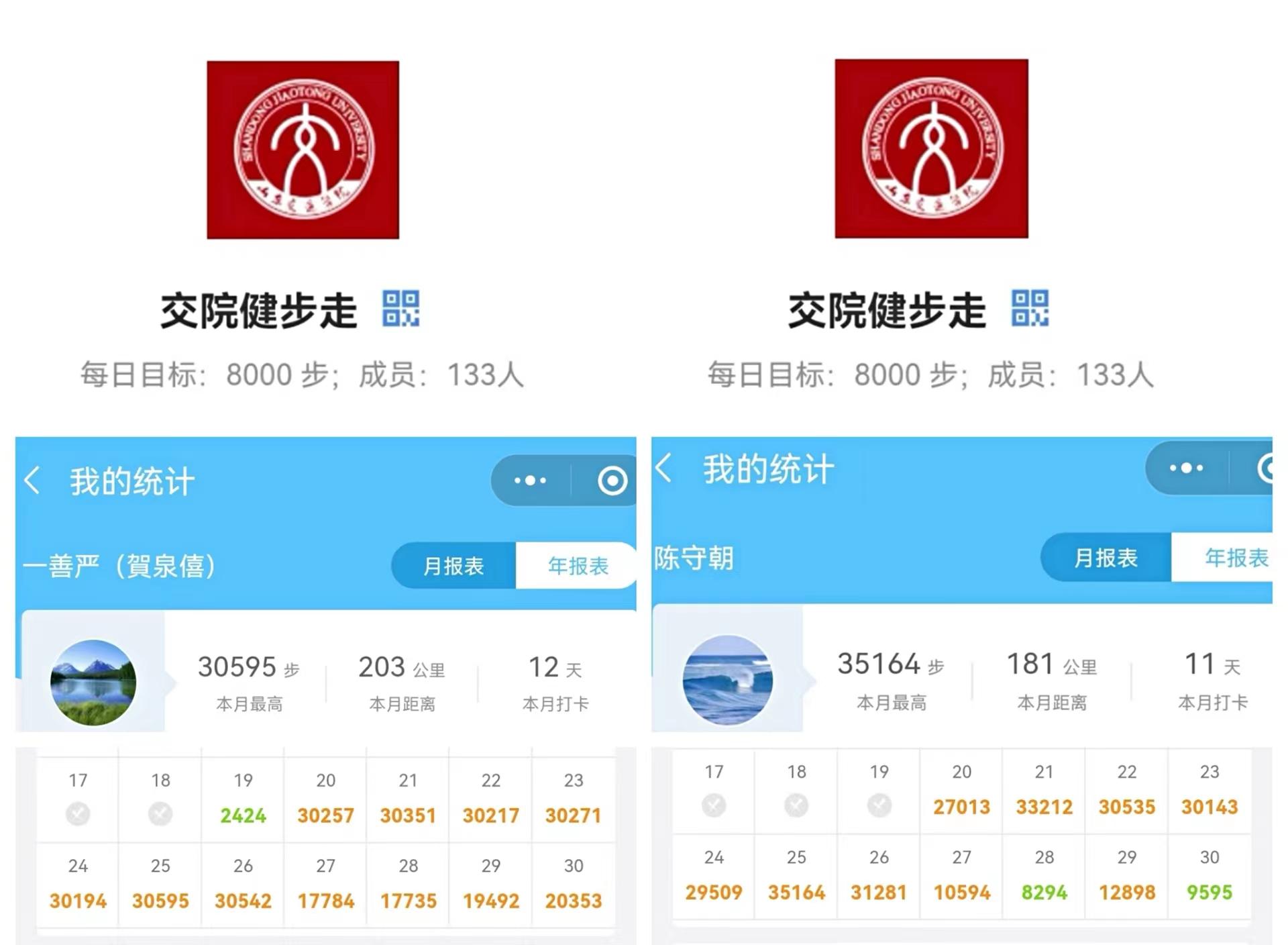 长清校区组织教职工开展了“相约校园,健身防疫”健步走活动。教职工自行选择校园内行走路线,通过登录微信小程序“运动步数榜”加入“交院健步走”作为数据源,记录活动期间每日步数情况。活动设置了一、二、三等奖和纪念奖,百余名教职工踊跃参与。