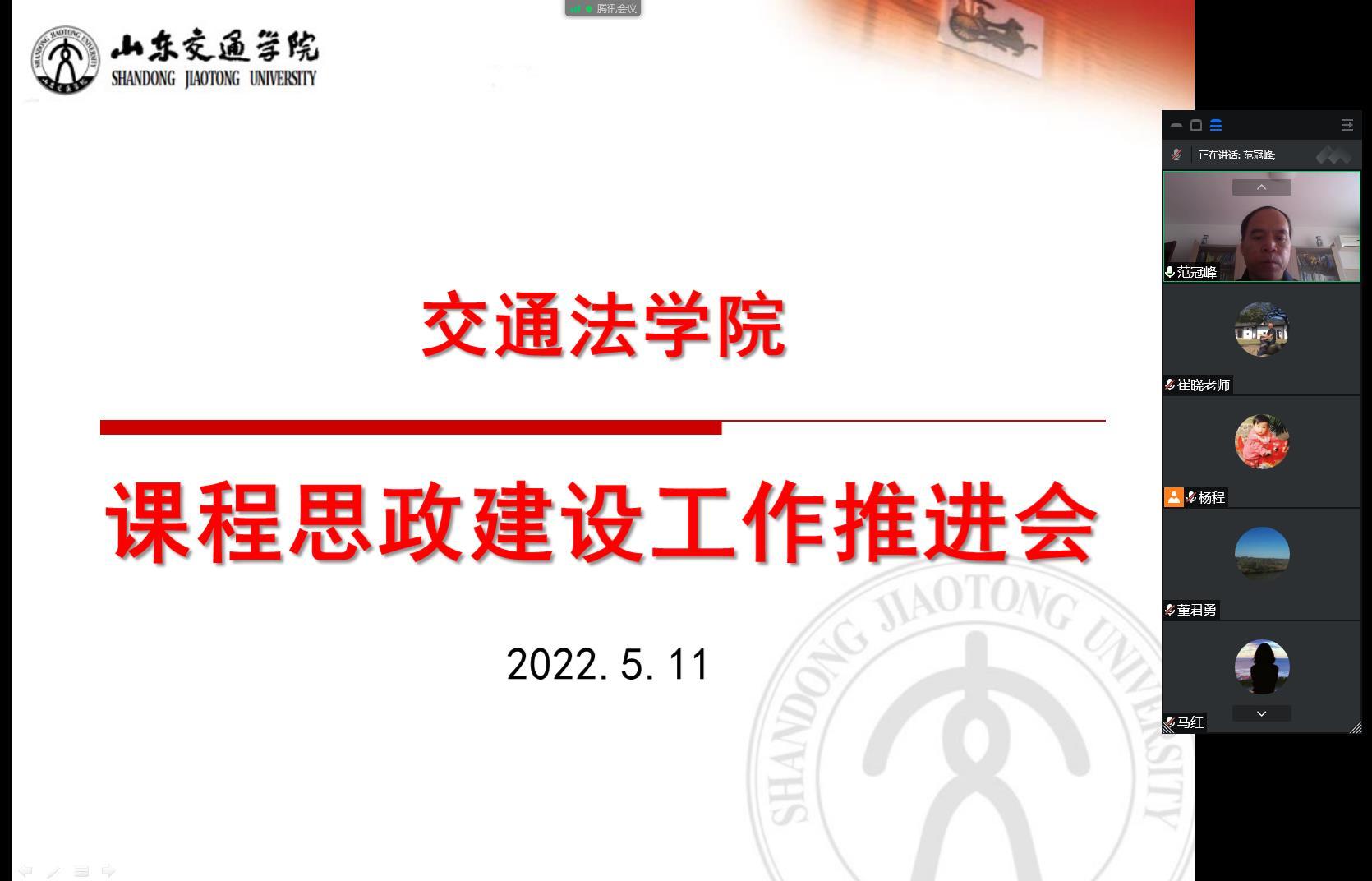 5月11日下午,交通法学院通过线上形式举行了课程思政建设工作推进会。会议由学院院长范冠峰主持,学院党委书记闫淼、全体教师参加会议。