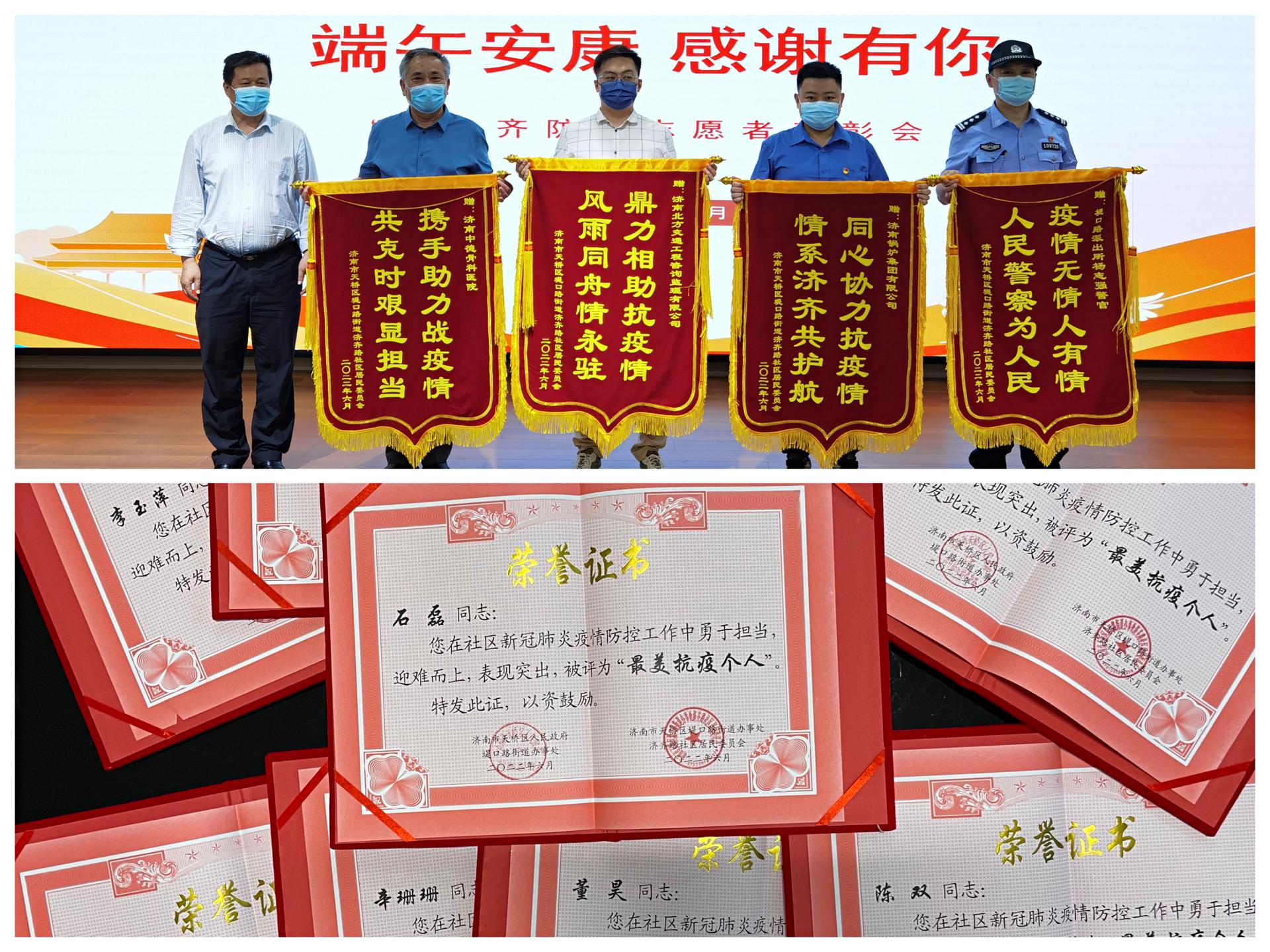 6月1日上午,天桥区人民政府堤口路街道办事处和济齐路社区居民委员会举办抗疫志愿者表彰大会,对参与社区防疫工作的单位和志愿者进行表彰。我校北方监理公司作为受表彰单位之一收到了写有“鼎力相助抗疫情 风雨同舟情永驻”的锦旗,公司10名参与疫情防控的志愿者荣获“最美抗疫个人”荣誉证书。