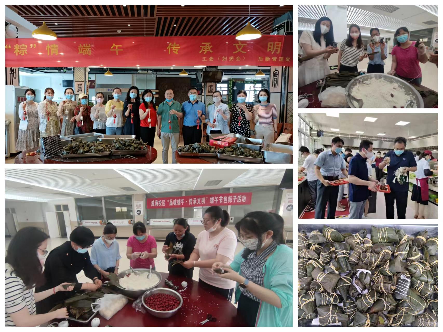为传承和弘扬传统民俗文化,倡树新时代美德健康生活方式,6月3日端午节,学校工会、后勤管理处组织教职工开展了“‘粽’情端午,传承文明”为主题的包粽子活动。活动在威海校区和济南校区同步进行。济南山交教育咨询服务有限公司为活动提供了食材原料。