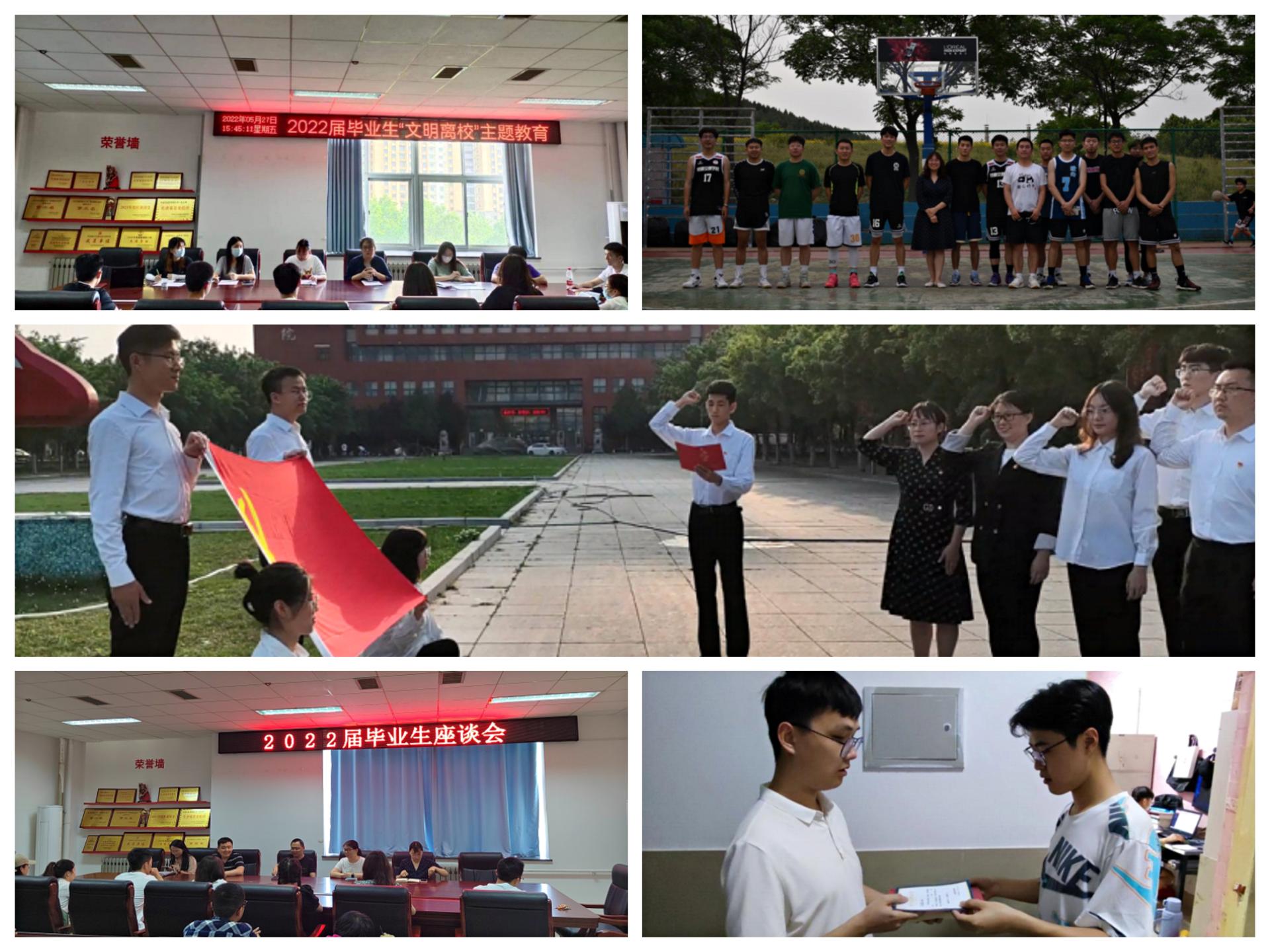“一次主题教育忆往昔”,学院开展“回忆、感恩、责任、奉献”文明离校主题教育活动,毕业生们通过回忆自己大学四年在校学习、生活的所得、所失进行总结,进一步取长补短、共同提高,强化责任、文明离校;“一场篮球比赛赞青春”,学院开展2022届“毕业杯”篮球赛,毕业生在赛场上满怀激情,配合默契,用他们的热情和汗水礼赞大学青春年华;“一堂别样党课亮身份”,学院组织毕业生党员齐上在校期间“最后一堂党课”,重温入党誓词,希望毕业生党员时刻牢记党员身份,提高党性修养;“一次亲切座谈话未来”,学院组织召开毕业生座谈会,向优秀毕业生、校友联络员颁发证书,学院领导与毕业生代表亲切交流,听取毕业生代表对学院在课程设置、专业教学、学科竞赛等方面的意见建议,嘱托毕业生在注重个人成长的同时心系母校发展,共创美好未来;“一个暖心举动留余香”,学院开展“献爱心·捐书物”及“留一间洁净雅室”活动,毕业生自发为学弟学妹捐献书籍用品,传授过好大学生活的经验“秘籍”,自觉开展寝室清洁活动,发挥朋辈引领作用。