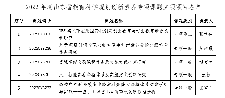 近日,山东省教育科学规划领导小组办公室公布了2022年度山东省教育科学规划创新素养专项课题立项项目名单,我校《OBE模式下应用型高校创新创业教育与专业教育融合机制研究》《基于项目引领的职业教育学生创新素养分段分级培养体系研究》等5项项目获得立项。其中重点项目1项,一般项目4项。