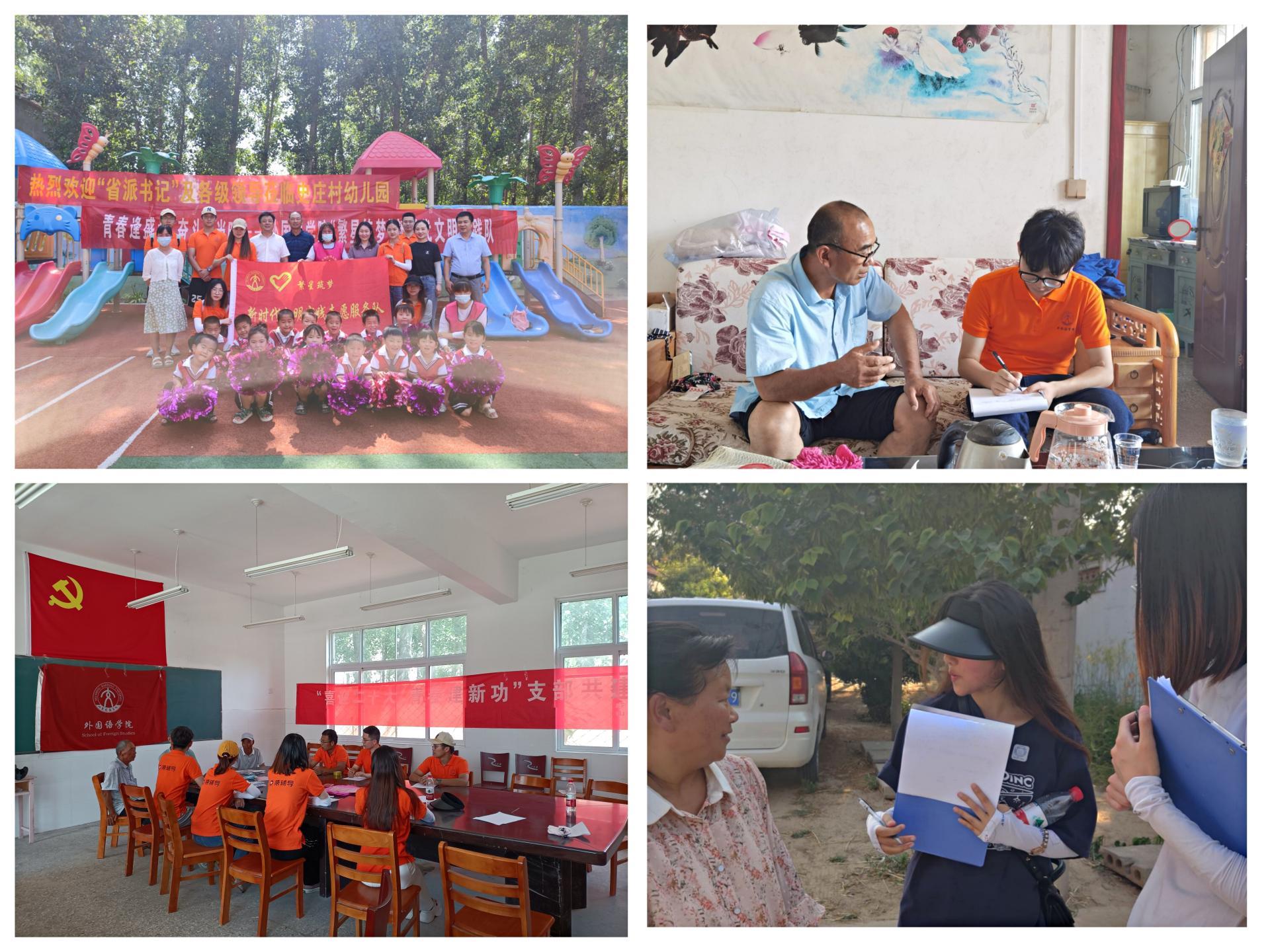 爱心支教,同守未来,实践团与当地幼儿园的孩子们进行面对面互动交流,了解他们的生活状况及学习情况,通过学业辅导、亲情陪伴等形式提供暑期辅导,把关爱与祝福传递给每一个孩子;开展入户调研,助力乡村振兴,实践团深入乡村,从发展建设、乡村治理、产业转型等角度,先后对当地史庄、前赵、后赵、楚楼4个自然村开展入户调研,完成问卷700余份,引导青年学生以实际行动投身乡村振兴,增强时代责任;依托支部共建,提升党性修养,学院学生党支部与菏泽市成武县汶上集镇史庄村第二党支部作为共建支部,共同开展了“喜迎二十大,青春建新功”主题党日活动,活动中学生党员们聆听老党员讲党史,让红色基因薪火相传。