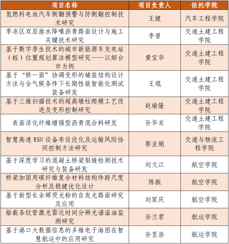 近日,山东省交通运输厅公布了2022年度交通运输科技计划立项名单。我校作为第一承担单位共有12个项目获批立项。