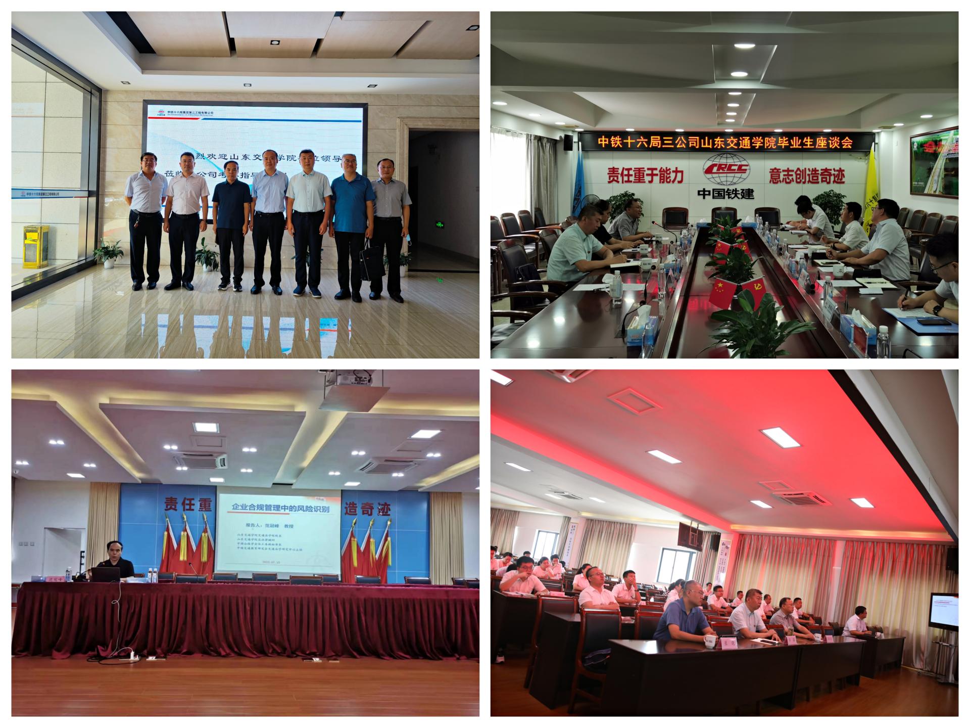交通法学院党委书记闫淼、院长范冠峰一行四人走访位于浙江湖州的中铁十六局集团第三工程有限公司。公司党委书记李伟、副总经理陈奇仁、纪委书记刘宇龙接待调研组,并与调研组深入交流。
