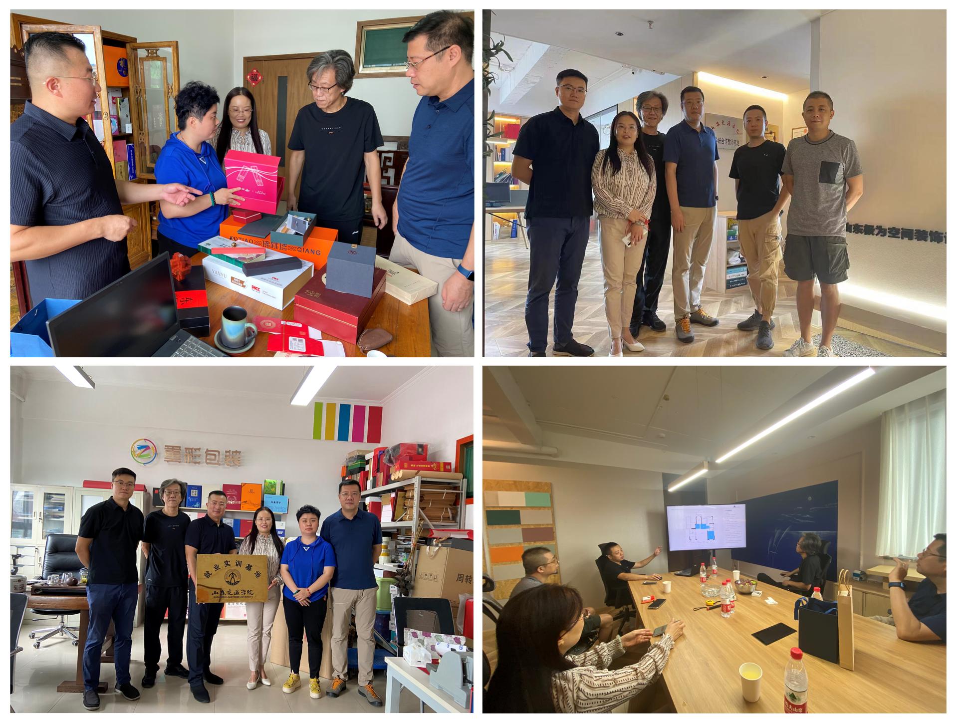 在校友企业的走访中,学院院长孙龙杰、党委副书记亓秀梅、副院长邹立禹等一行4人了解了校友企业的主营项目。学院与校友企业就行业包装制作、室内设计现状与发展趋势进行了交流,并分别举行了产学研合作教育基地和就业实训基地的挂牌仪式。校友们纷纷表达了对学院及学校的关心和支持,了解了近年来学院建设规划与专业发展情况。双方就产品包装研发、文创产品礼盒设计、学生实习就业及校外导师聘任等方面的合作事宜达成一致。