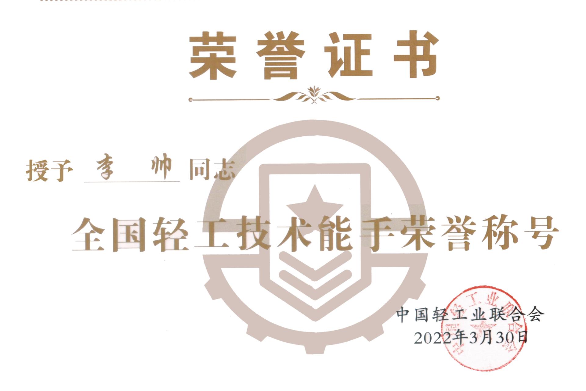 日前,2022年全国行业职业技能竞赛轻工大赛动员大会在重庆举行。大会为2021年轻工行业“全国五一劳动奖章”获得者、“全国轻工技术能手”及轻工大赛获奖单位颁发奖章和证书,我校艺术与设计学院教师李帅获“全国轻工技术能手”荣誉称号。
