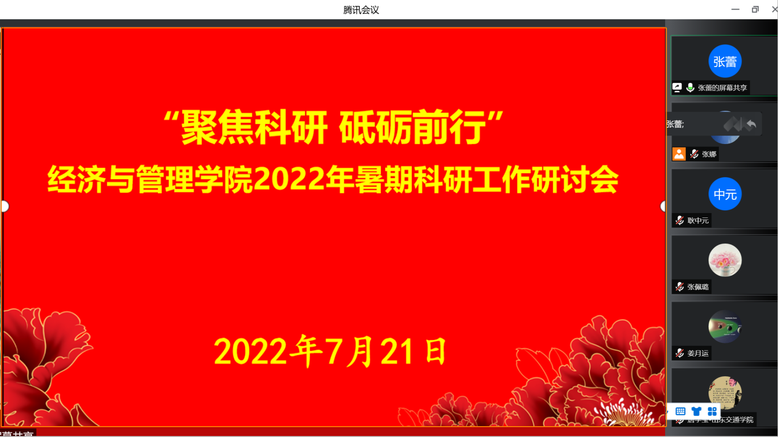 为营造良好的科研学术氛围、提升科研学术水平、增强社会服务能力,7月21日,经济与管理学院在线召开2022年暑期科研工作研讨会。经济与管理学院领导班子及学院教师参加会议。会议由经济与管理学院副院长张蕾主持。