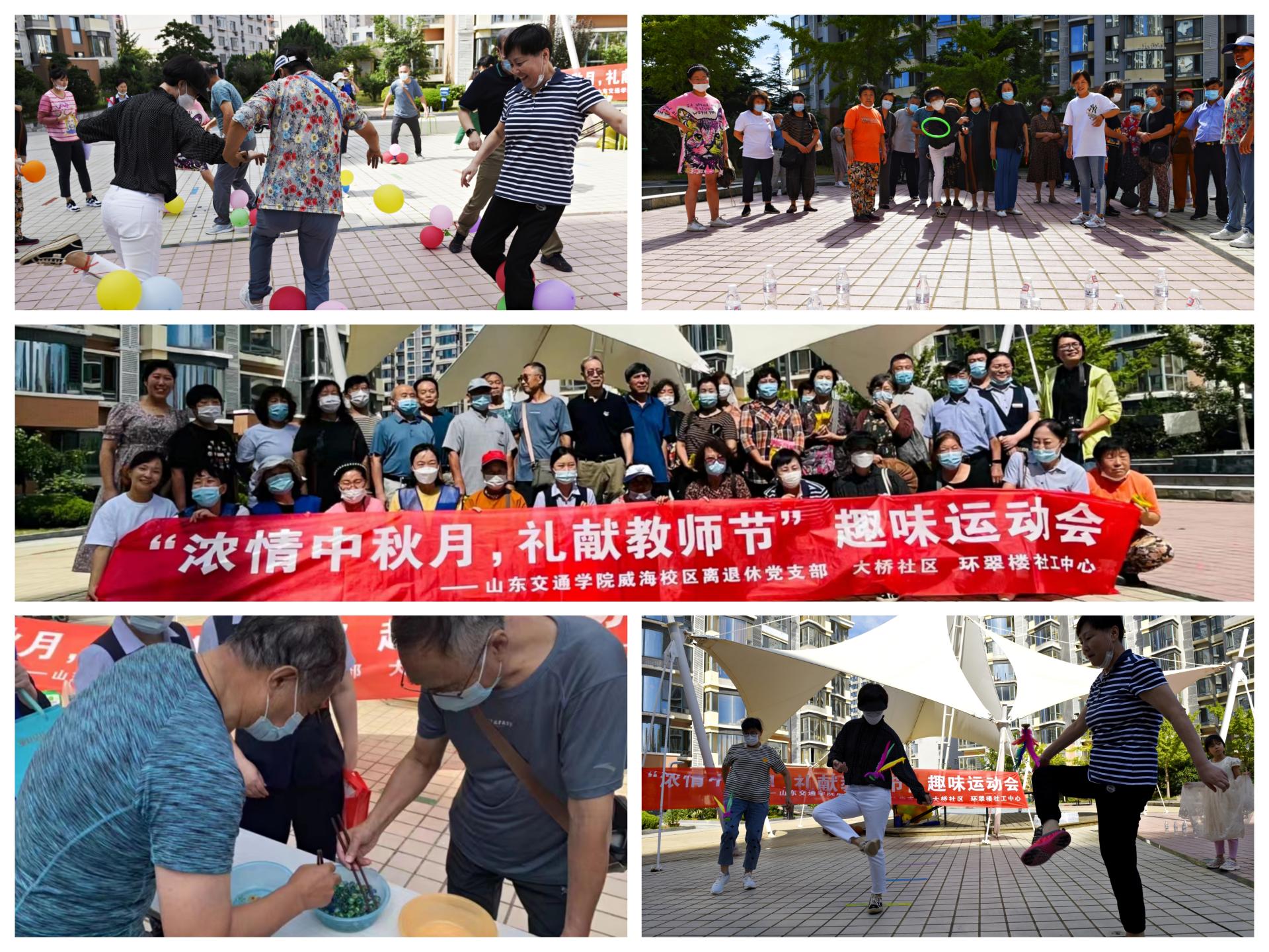今年的传统中秋节喜逢教师节。为欢庆“双节”到来,丰富离退休教职工的精神文化生活,近日,威海校区离退休党支部与共建党组织——威海环翠楼街道大桥社区党委共同举行了“浓情中秋月 礼献教师节”趣味运动会。