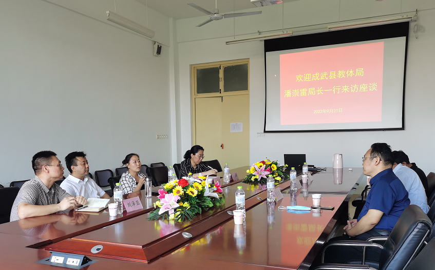 9月21日下午,菏泽市成武县教体局局长潘崇雷一行三人来我校外国语学院走访交流。外国语学院党委书记马昭,党委副书记、院长宋岩岩及系部相关负责人参加座谈会。会议由马昭主持。