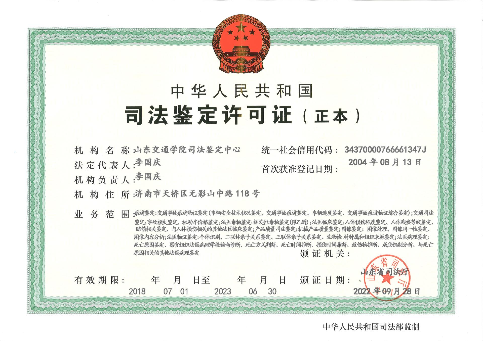 近日,山东省司法厅给我校司法鉴定中心颁发了新的司法鉴定许可证,正式批准我校司法鉴定中心新增法医病理、DNA二联体亲子关系鉴定资质。