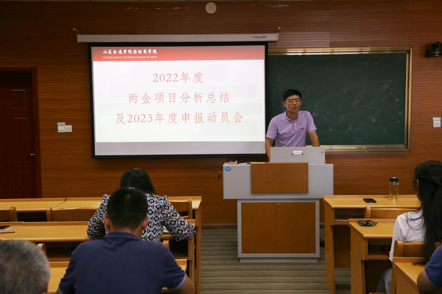 国际商学院在威海校区2号教学楼学院录播室组织召开2022年国家“两金”项目分析总结及2023年度申报动员会。