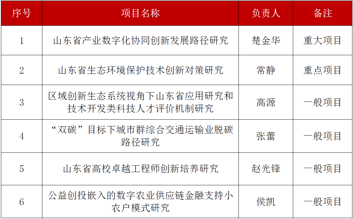 近日,山东省科学技术厅发布了《关于下达2022年度山东省重点研发计划(软科学项目)的通知》,我校6项课题获得立项。其中重大项目1项、重点项目1项、一般项目4项,这是我校首次同时获批山东省重点研发计划(软科学项目)重大项目和重点项目。