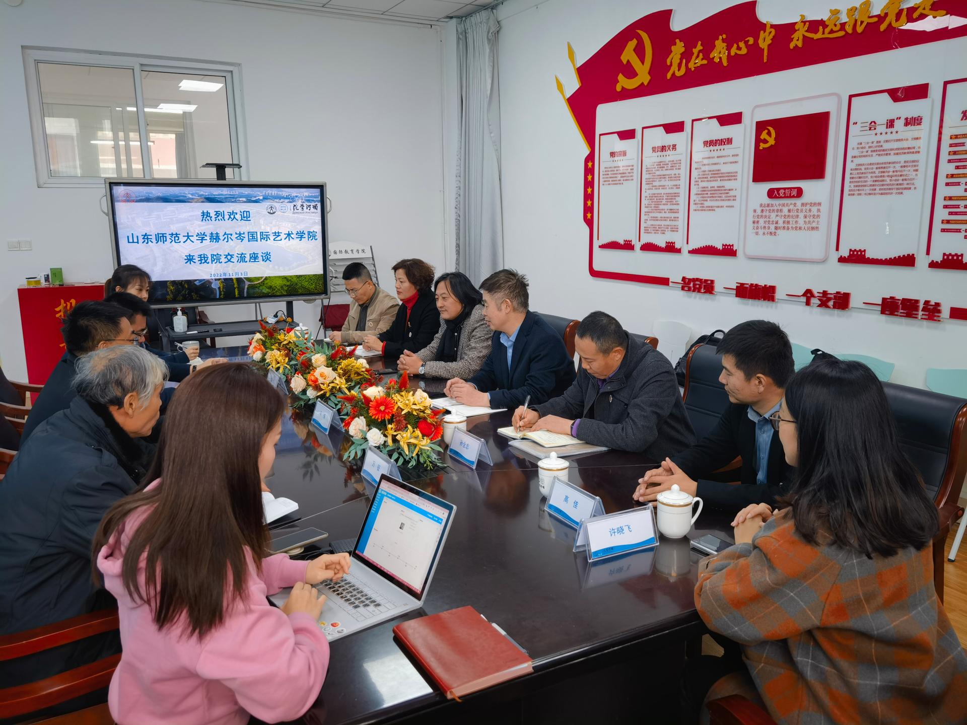 11月3日下午,山东师范大学国际合作与交流处处长、赫尔岑国际艺术学院直属党支部书记周连勇一行7人来我校调研座谈,学校在长清校区2号教学楼510会议室举行座谈会。国际合作交流处(台港澳事务办公室)处长马彧,国际教育学院、顿河学院院长刘春光参加会议。