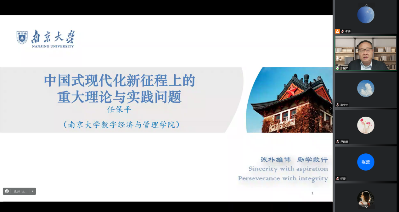 本次报告会邀请南京大学数字经济与管理学院特聘教授、博士生导师任保平作题为《中国式现代化新征程上的重大理论与实践问题》的报告。任保平从领会把握党的二十大精神入手,着眼“一个中心任务、十个方面的支撑”深入解读了党的二十大报告内容,对中国式现代化新征程上的重大理论与实践问题进行了系统梳理和深入分析。