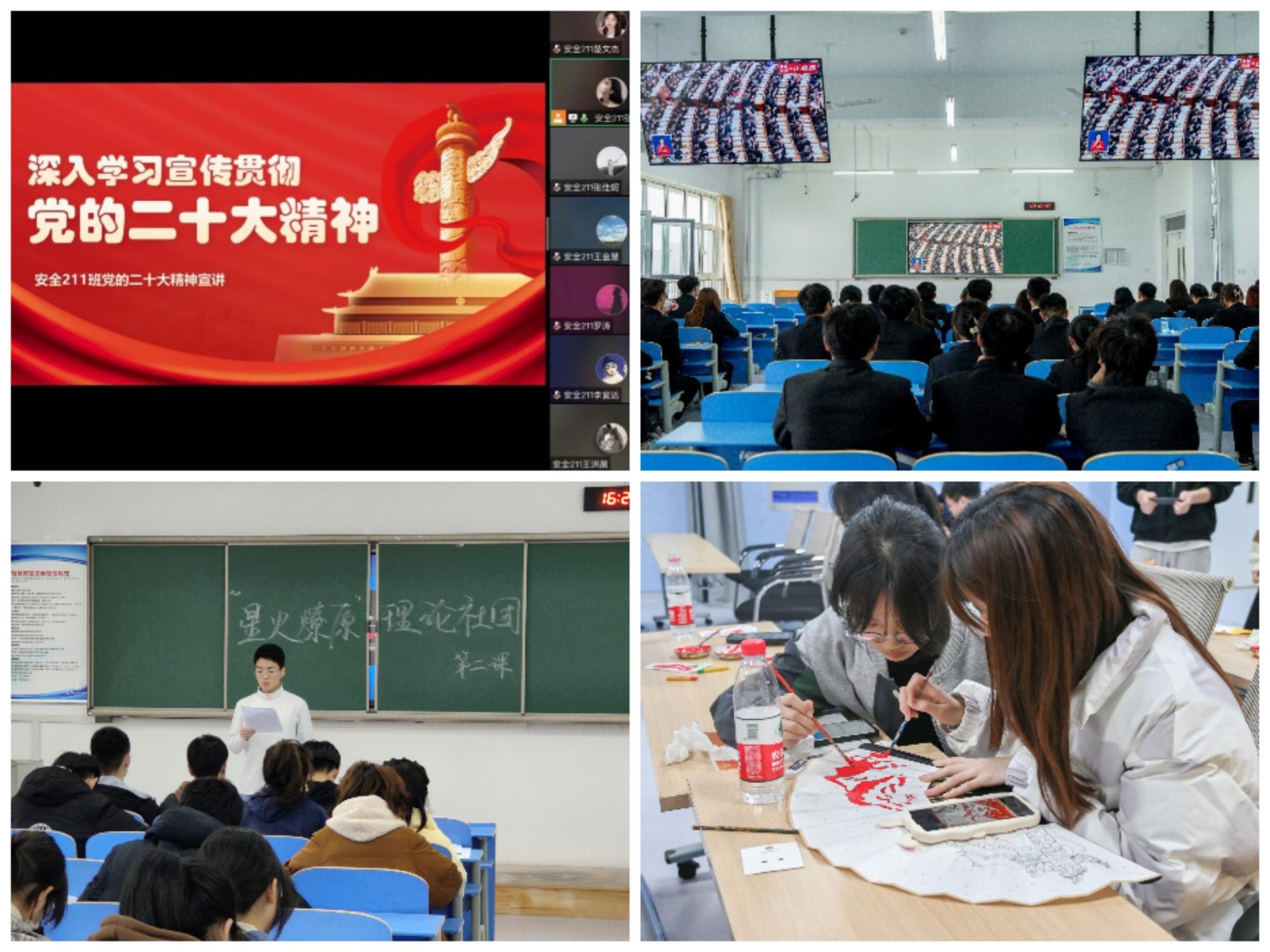 线上云聚打卡,深学细研。学院以“云班会”“云团日”等方式,组织开展专题学习、线上答题竞赛、微视频征集等活动,坚持全覆盖宣传、分众化引导相结合,推动党的二十大精神深入“生”心、落地生根。线下知行合一,入脑入心。学院依托“星火燎原”理论社团推出“学思践悟二十大”主题宣传教育实践活动,编制、发放党的二十大报告基本知识点问答材料,并灵活运用“青言青语”宣讲党的二十大精神;举办“扇面绘初心”绘画大赛,青年学生以传统扇面为载体,以字明志、以画传情,在喜闻乐见的形式中激发学习热情。