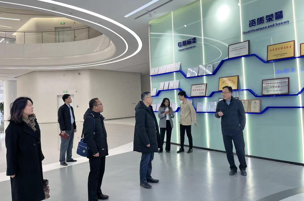 在山大地纬软件股份有限公司,单宝森一行在公司人力资源与战略发展中心高级顾问、总经理助理陈志勇,公司招聘与人才发展部部长王文强的陪同下,参观了公司园区智慧展厅,详细了解了公司的发展概况及行业数字化创新应用场景和实践案例。