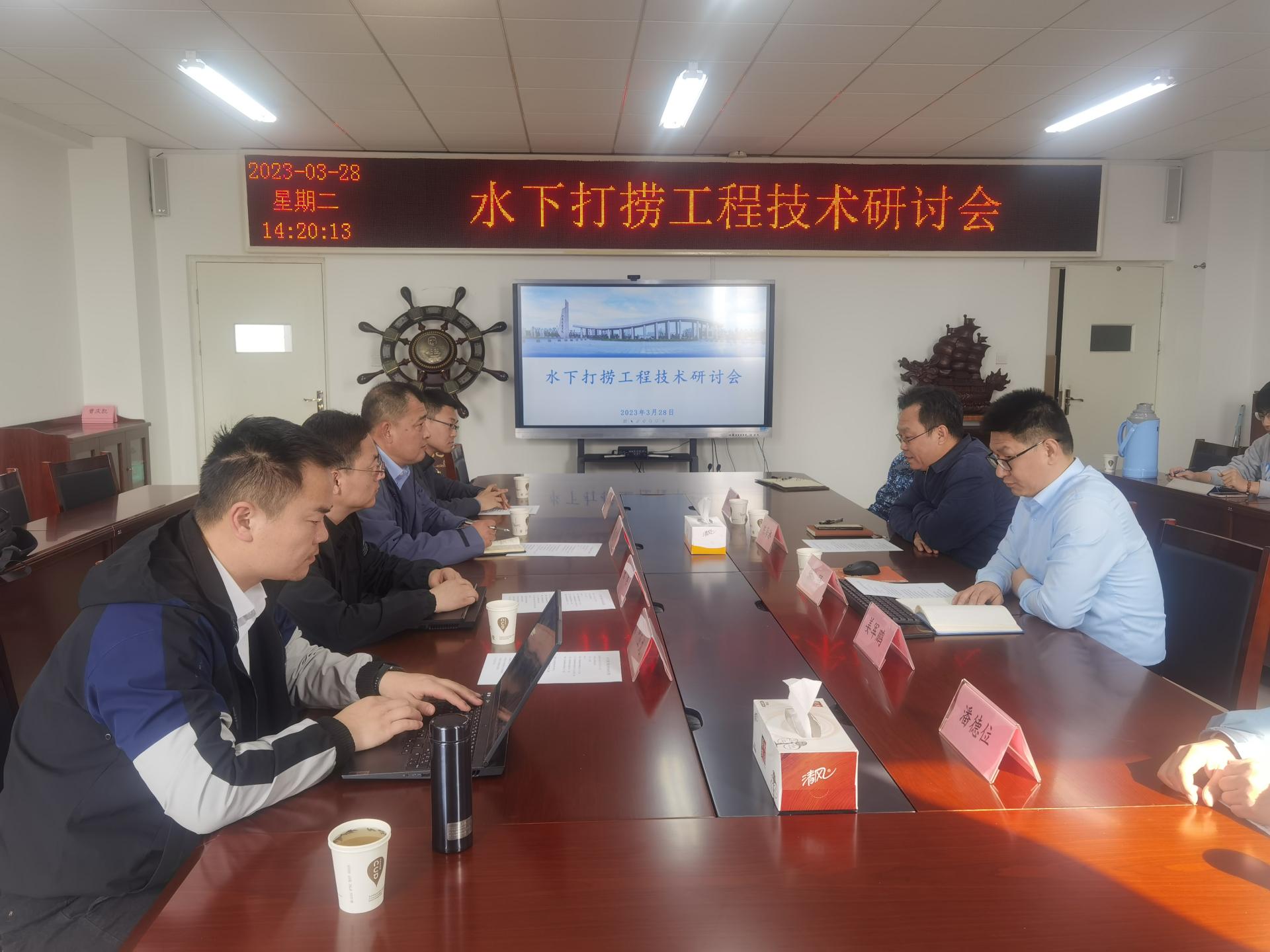 3月28日,航运学院在威海校区学院会议室召开水下打捞工程技术研讨会。交通运输部烟台打捞局技术中心主任都光明、技术负责人张伟,航运学院党委书记陈海泳、副院长张强参加研讨会。