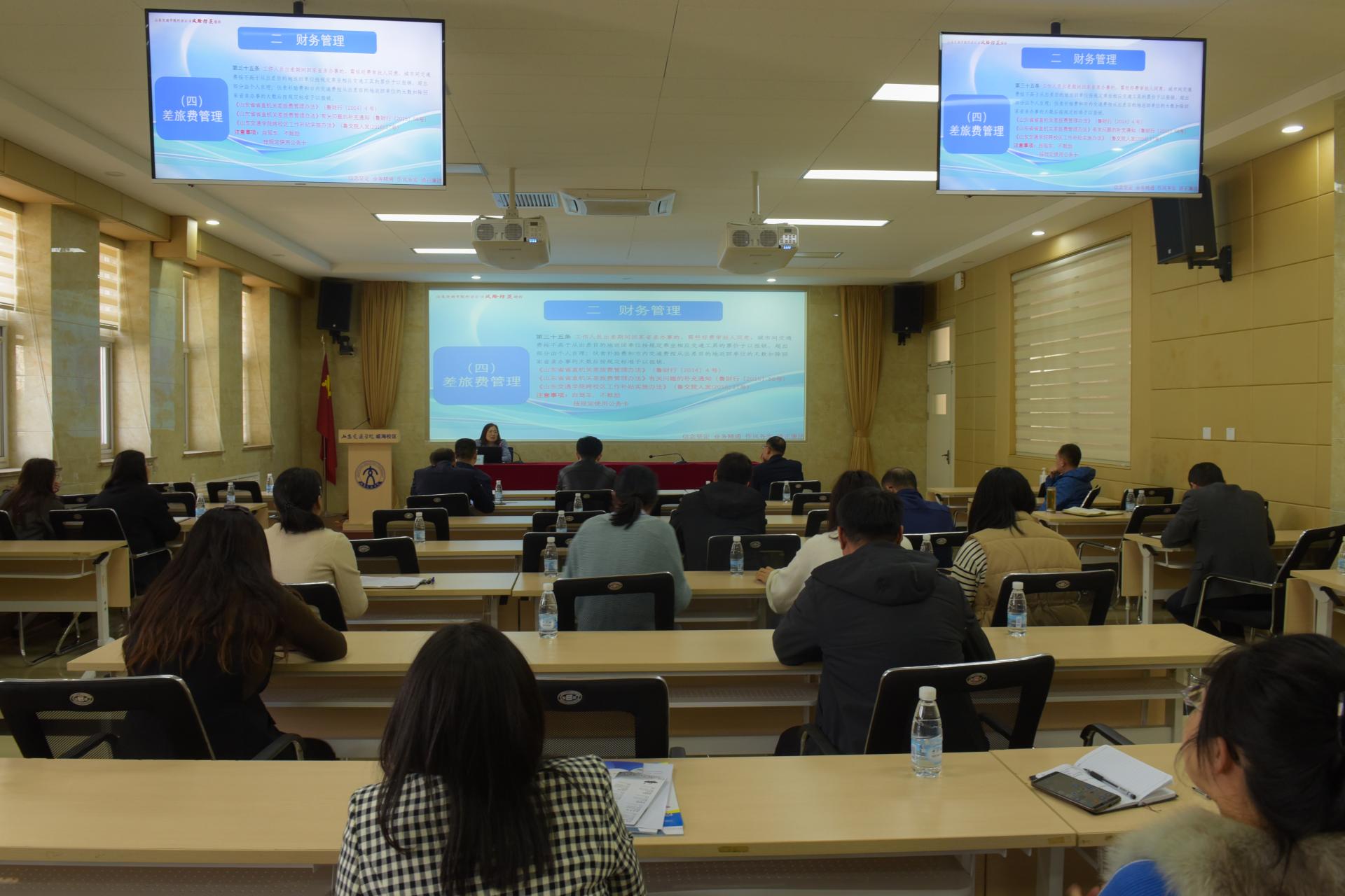 审计处副处长王桂芬担任主讲,从“三重一大”决策、财务管理、“三公经费”管理、国有资产管理、科研经费管理、合同管理、招标与采购管理等七个方面出发,针对不同人员,围绕不同侧重点,分别面向管理人员、教学科研人员做经济活动风险防范以及科研活动风险防范宣讲。