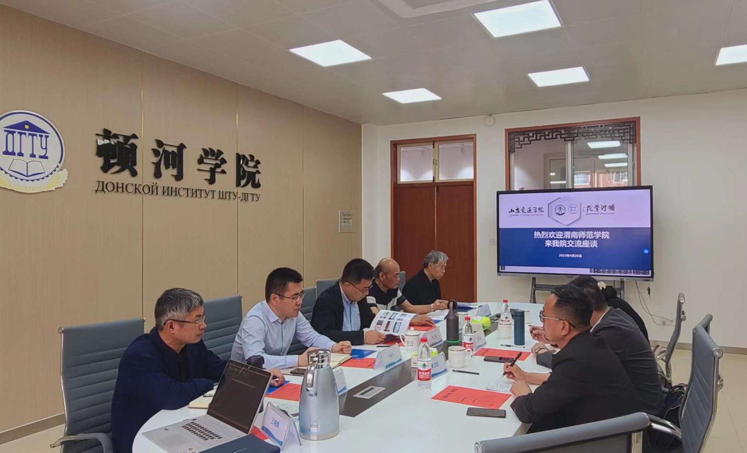 马彧对渭南师范学院的来访表示欢迎,介绍了我校国际交流合作的总体情况,他希望进一步加强学校与渭南师范学院之间的联系,共同探索国际交流合作新模式、新方法、新出路。刘春光详细阐述了国际教育学院、顿河学院中外合作发展历史、办学特色、人才培养情况,并期待双方发挥各自优势,在更多领域开拓合作空间,助推双方在中外合作办学领域高质量发展。郭石磊对我校的热情接待表示感谢,介绍了渭南师范学院的办学条件、发展历程、学科专业等方面情况,期待继续加强两校的合作与交流,互相借鉴经验,共同提升教育教学质量,推进两校发展。