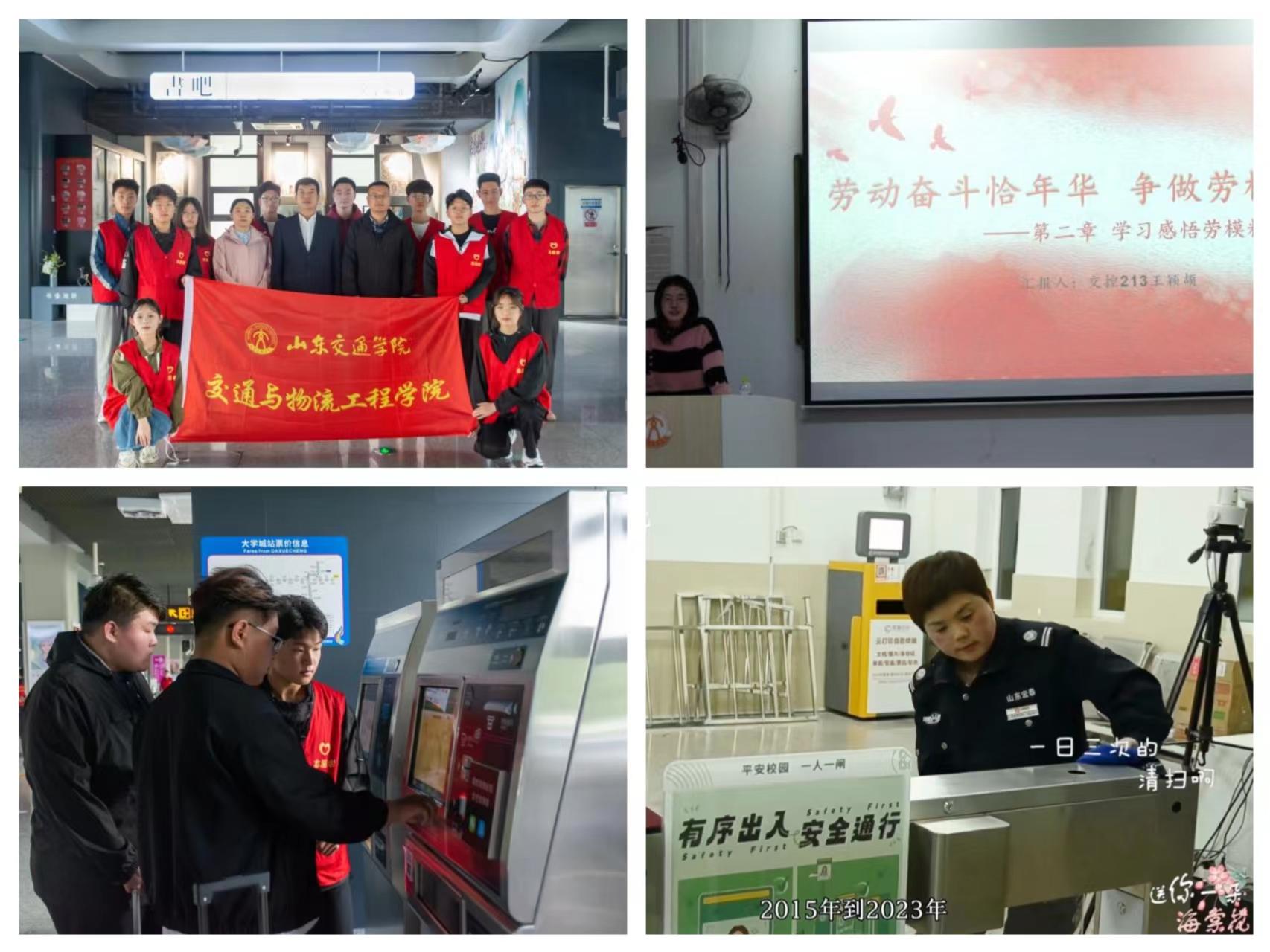 活动中,交通与物流工程学院组织学生以“劳模精神”为主题开展政治学习,观看“全国示范性劳模”的纪实短片,感受劳模们在平凡的岗位上不平凡的奋斗故事;拍摄《送你一朵海棠花》视频,记录教师、后勤工作人员在各自的工作岗位上辛勤劳动、诚实劳动的身影,定格精彩的劳动瞬间;组织师生前往济南园博园地铁站等处进行志愿服务,在工作人员的指导下开展文明乘车引导、乘客咨询解答、维持站内秩序等工作,真切感受交通行业劳动者的责任与光荣。