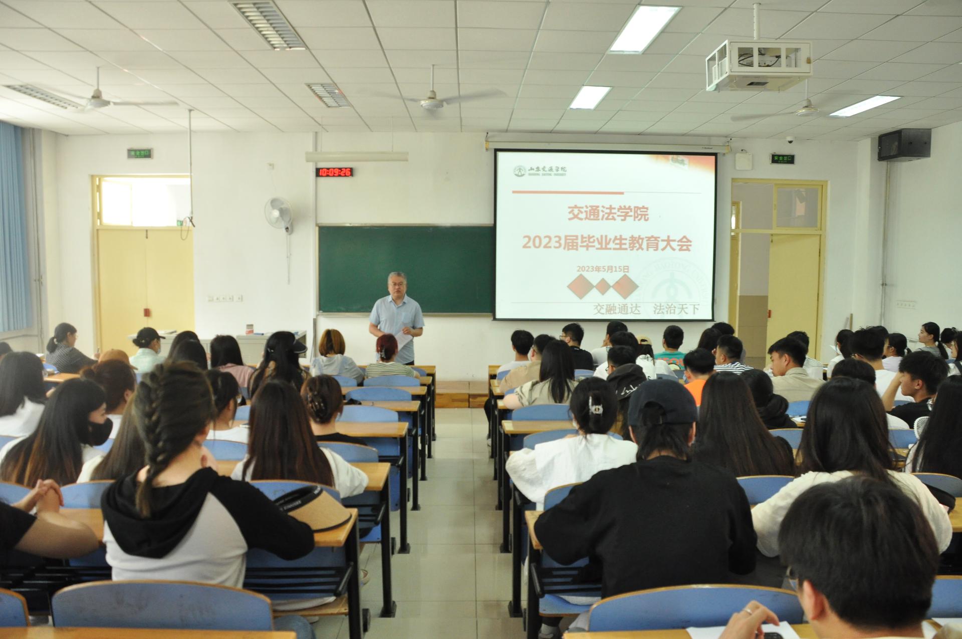 交通法学院举行2023届毕业生教育大会。学院党委副书记崔晓解读了各类就业创业优惠政策,鼓励毕业生们树立正确的就业观念,充分了解西部计划、参军入伍、返乡创业等政策,实现多渠道就业,并表达了对毕业生即将离开母校的不舍和祝福。他希望,全体毕业生做幸福奋斗的时代新人,常感母校恩、长记母校情,为母校发展献计献策、为母校建设添砖加瓦。辅导员详细讲解了毕业生离校的各项具体准备工作,为同学们上了在校思想政治教育“最后一课”,进一步加强毕业生的理想信念教育、感恩奉献教育、担当使命教育。