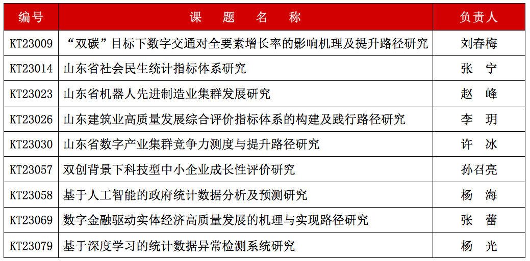 近日,山东省统计局、山东省统计学会公布了2023年度全省统计科研课题立项项目名单,我校《“双碳”目标下数字交通对全要素增长率的影响机理及提升路径研究》等9项项目获得立项。