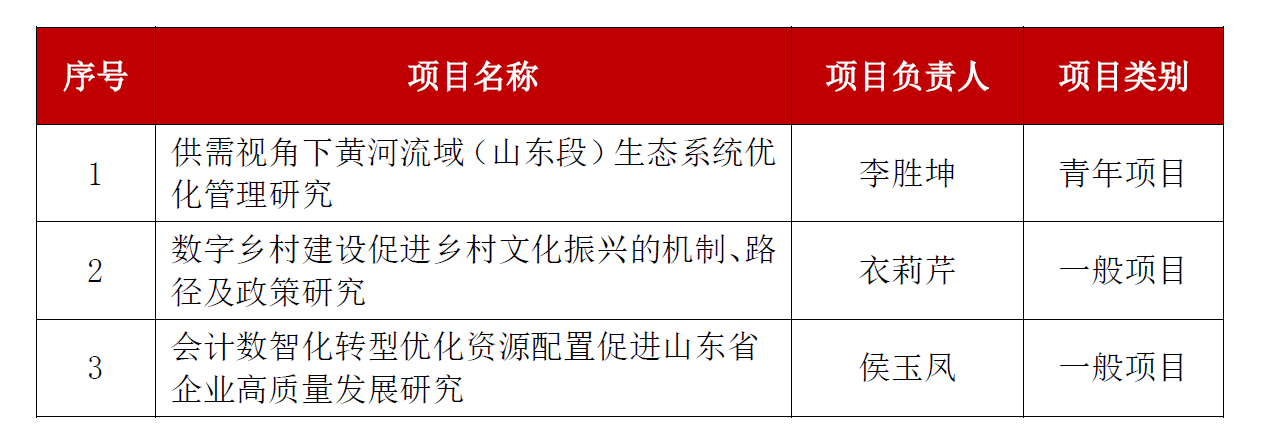 近日,山东省哲学社会科学工作办公室公布了2023年度山东省社会科学规划研究项目立项名单,我校3项课题获得立项。其中,青年项目1项,一般项目2项。